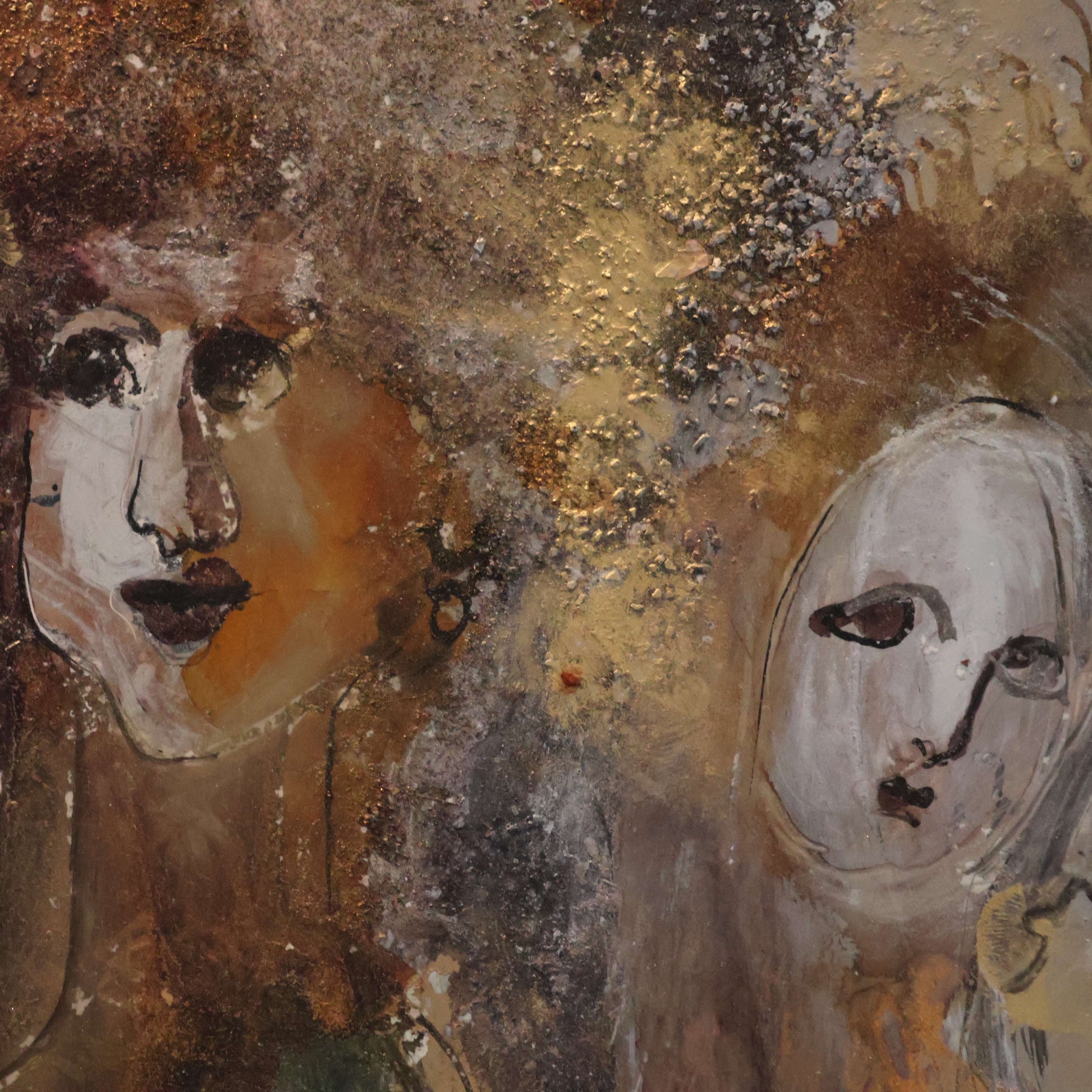 Die Szene wirkt wie ein Dialog zwischen Licht und Schatten: Gold- und Bronzetöne fließen über die Figuren, während silbrige Reflexe die Oberfläche durchziehen. Die drei Gestalten – halb Mensch, halb mythisch – scheinen in einer fließenden Bewegung miteinander verbunden zu sein. Ihre Körper lösen sich in der malerischen Struktur auf, ihre Gesichter bleiben schemenhaft, als wären sie aus Erinnerung geformt.