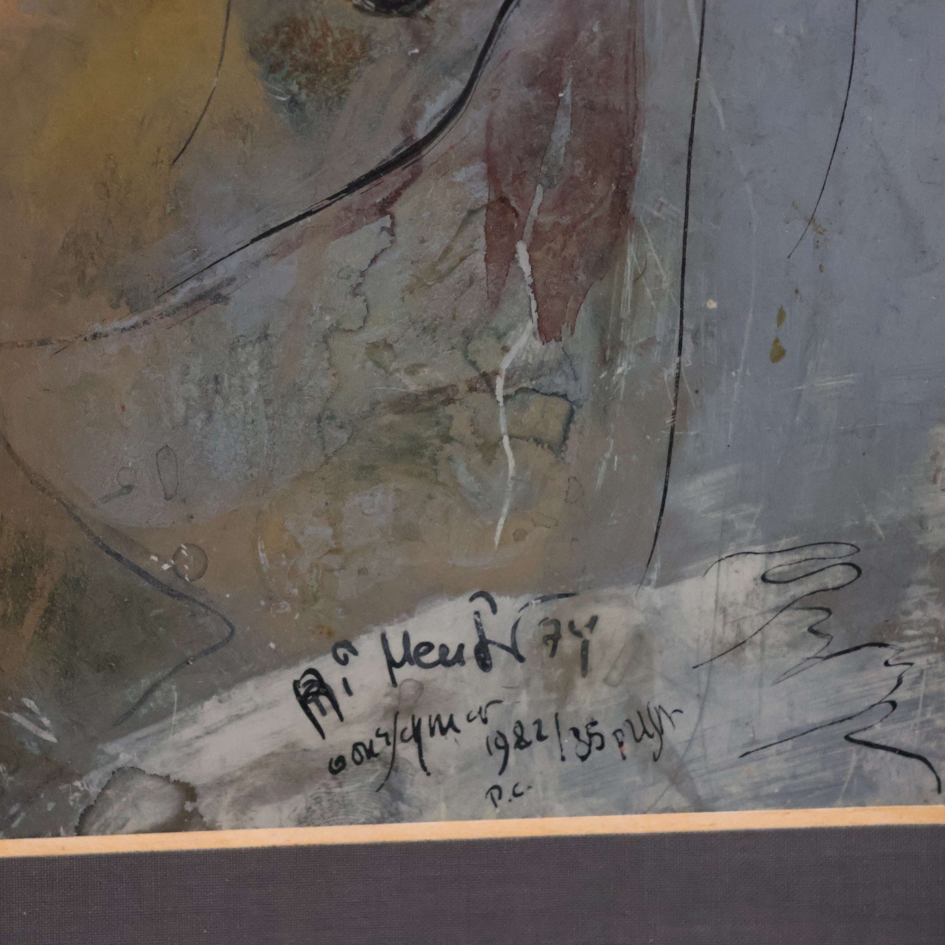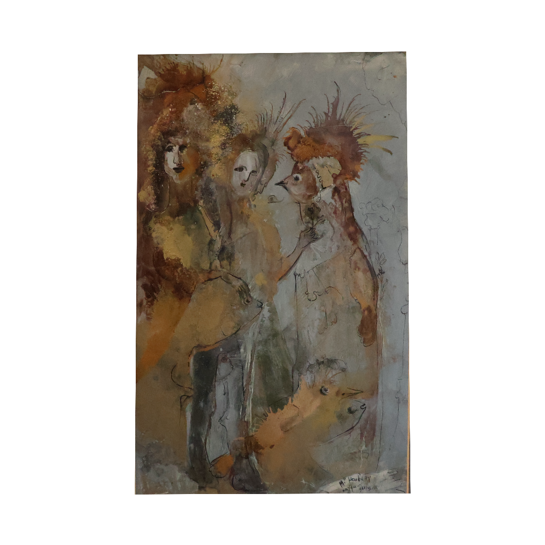 „Abendliches Gespräch“ ist ein Werk von stiller Tiefe – geschaffen zwischen 1982 und 1985, in einer Phase, in der Prof. Ri Meuser von Eschmar ihre Mono Sgraffito-Technik zur vollkommenen Reife führte. Es zeigt drei Figuren im vertrauten Austausch, eingefangen in jenem Moment zwischen Dämmerung und Nacht, in dem Worte leiser werden und Gedanken beginnen, Gestalt anzunehmen.