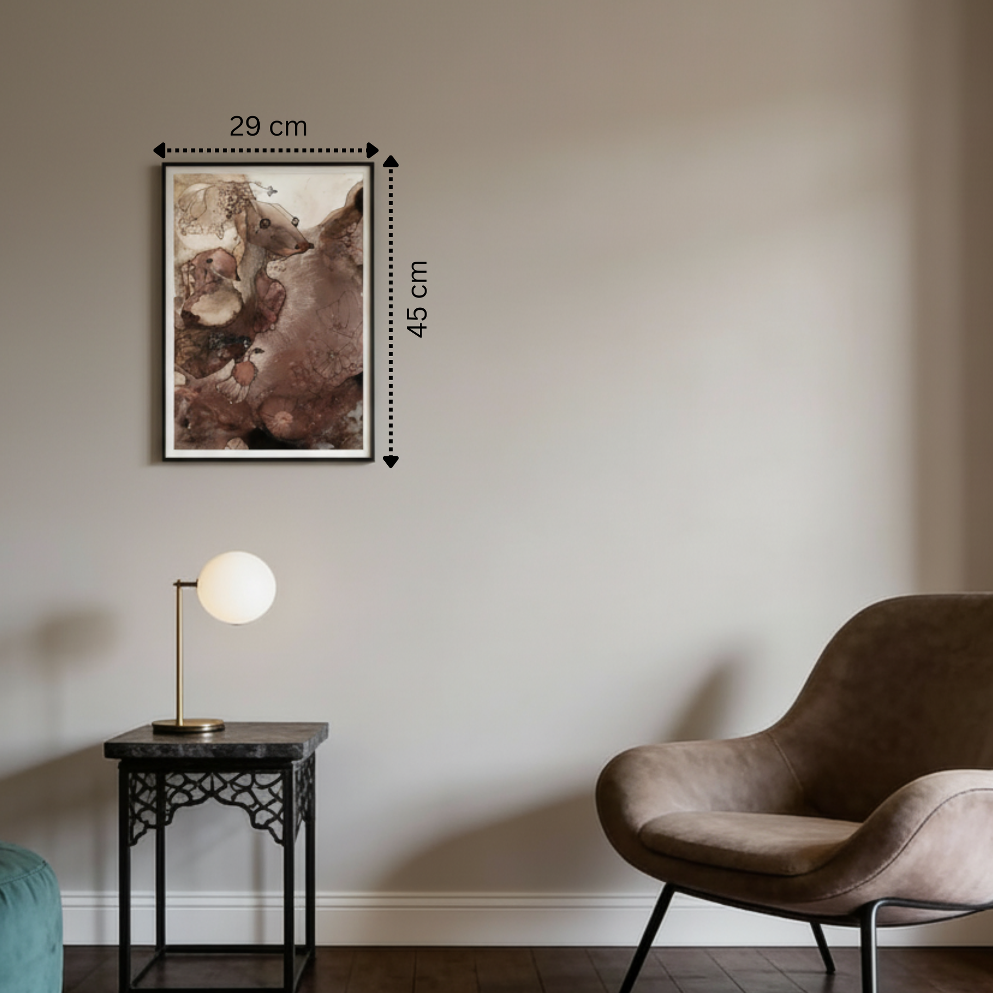 Feine Linien und schattenhafte Formen durchziehen die Oberfläche, als wären sie Spuren einer längst vergangenen Welt. In den erdigen, rauchigen Tönen schimmern Gold- und Rosépartien, die an alte Fresken oder verwitterte Fossilien erinnern. Aus dem Nebel der Textur tauchen Figuren und Gesichter auf – kaum sichtbar und doch gegenwärtig, wie Erinnerungen, die sich nicht ganz greifen lassen.