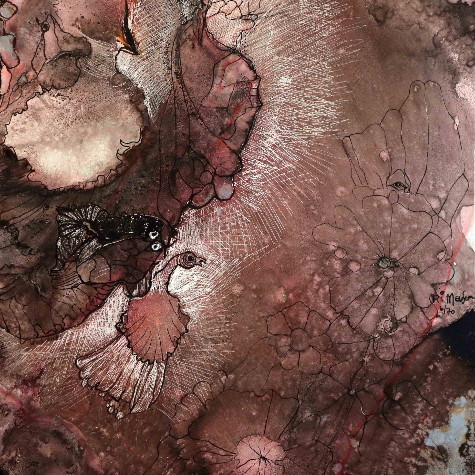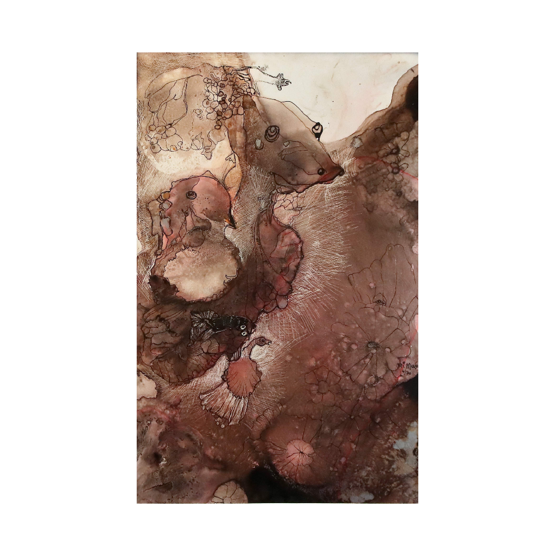 „Aus einer anderen Zeit“ aus dem Jahr 1970 gehört zu den frühen, visionären Werken von Prof. Ri Meuser von Eschmar – und zählt zu jenen Arbeiten, in denen sich bereits ihre unverwechselbare Handschrift abzeichnet: die Verbindung von Materie, Erinnerung und Symbolik. Entstanden in der von ihr selbst entwickelten Technik des Mono Sgraffito, zeigt das Werk, wie Farbschichten, Pigmente und Gravuren zu einer poetischen Einheit verschmelzen.