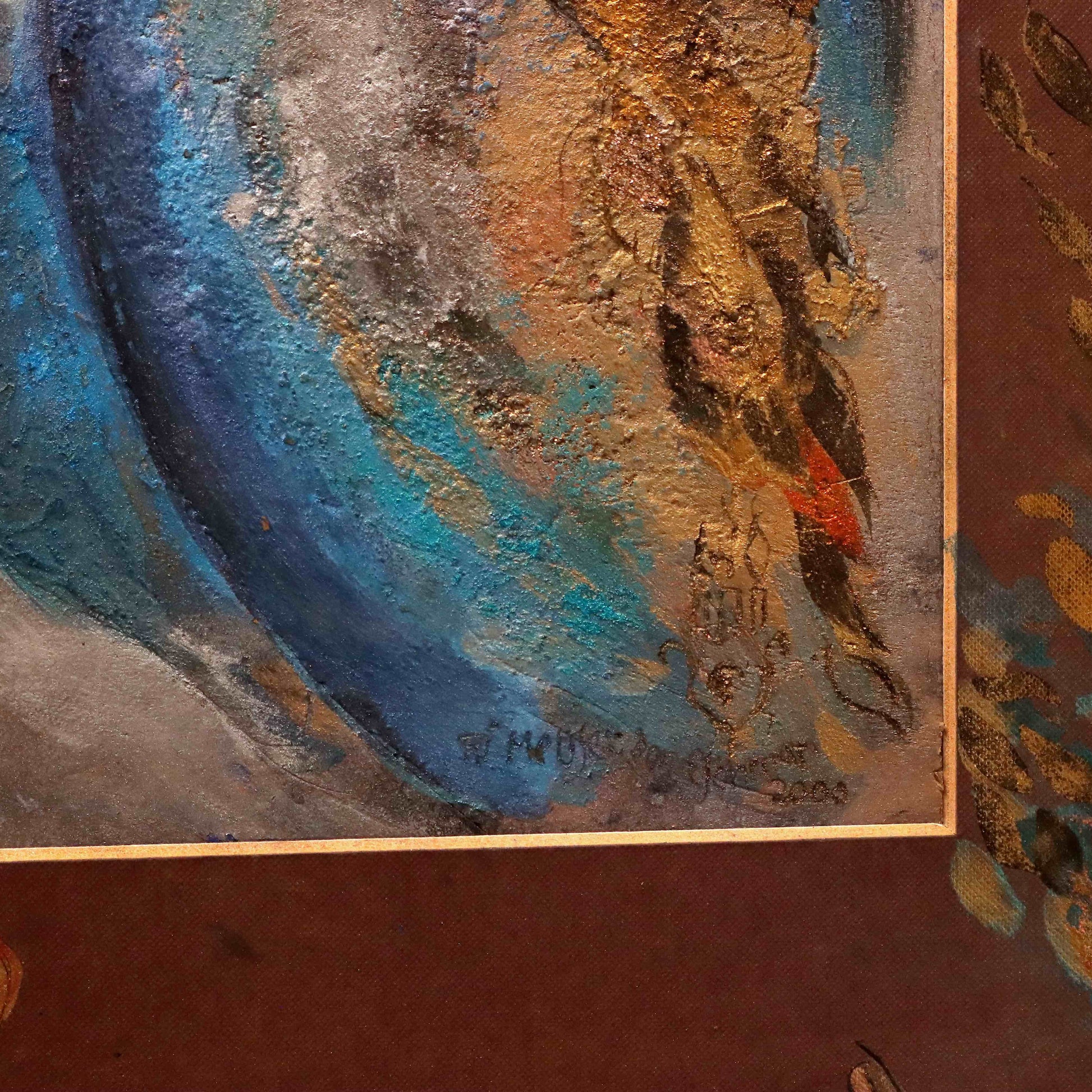 „Herbstblätter und Vogel“ aus dem Jahr 2000 ist ein Werk von sanfter Poesie und zarter Symbolkraft – ein leuchtendes Sinnbild für den Augenblick zwischen Abschied und Neubeginn. Prof. Ri Meuser von Eschmar erschuf dieses Bild auf einer Silverpuran-Folie, jener von ihr entwickelten Maltechnik, die durch Schichtung, Gravur und metallische Pigmente eine magische Tiefe und Bewegung entstehen lässt.