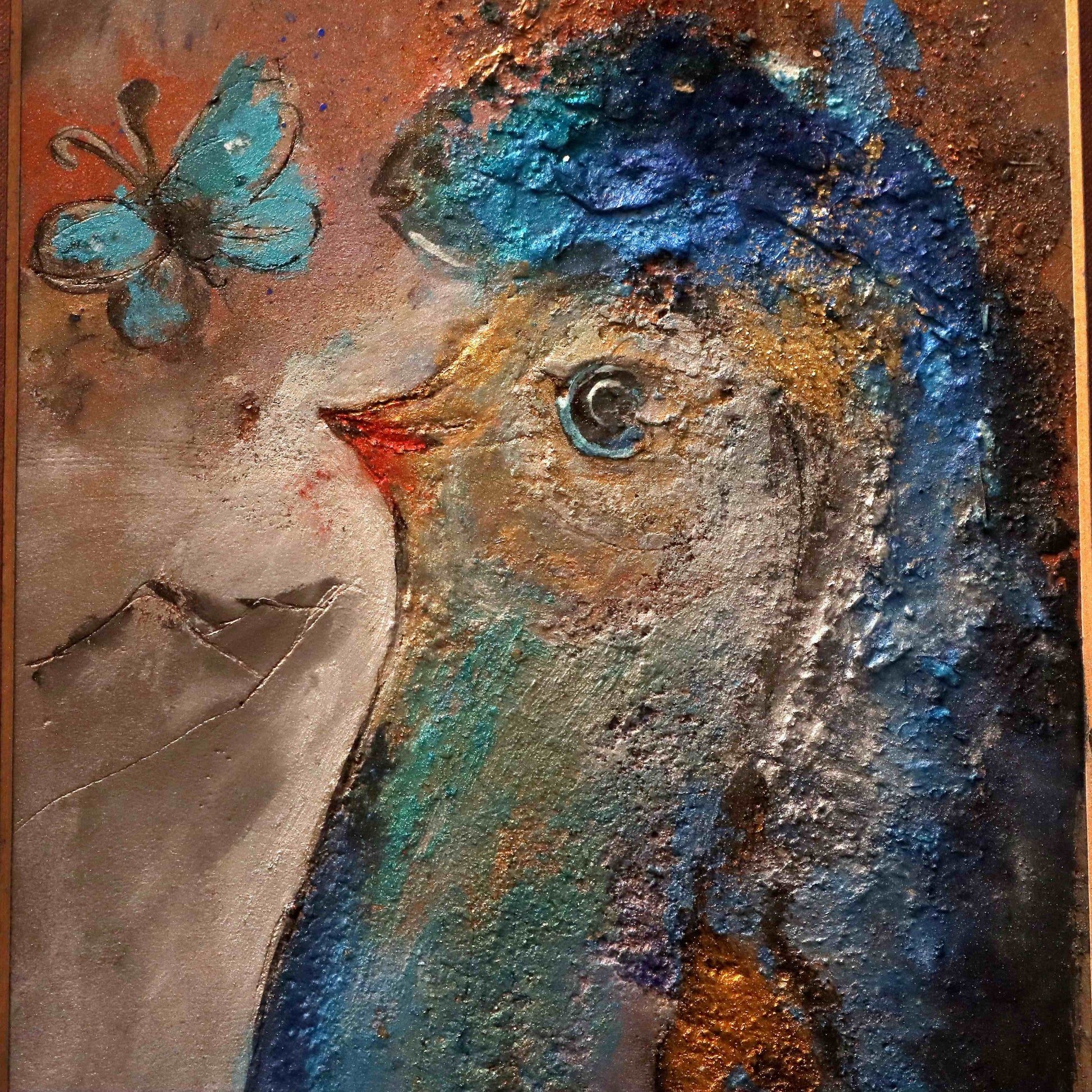 Im Zentrum steht ein schimmernder blauer Vogel – ruhig, stolz und zugleich verletzlich. Sein Blick richtet sich auf einen flatternden Schmetterling, der in hellem Türkis über ihm schwebt. Dieses Aufeinandertreffen von Vogel und Schmetterling ist mehr als ein Naturmoment: Es ist eine Begegnung zweier Wesen, die in unterschiedlichen Rhythmen leben – der eine erdverbunden, der andere flüchtig und frei.