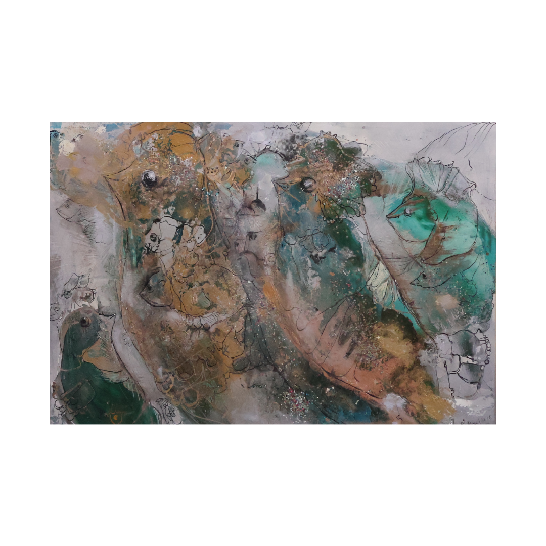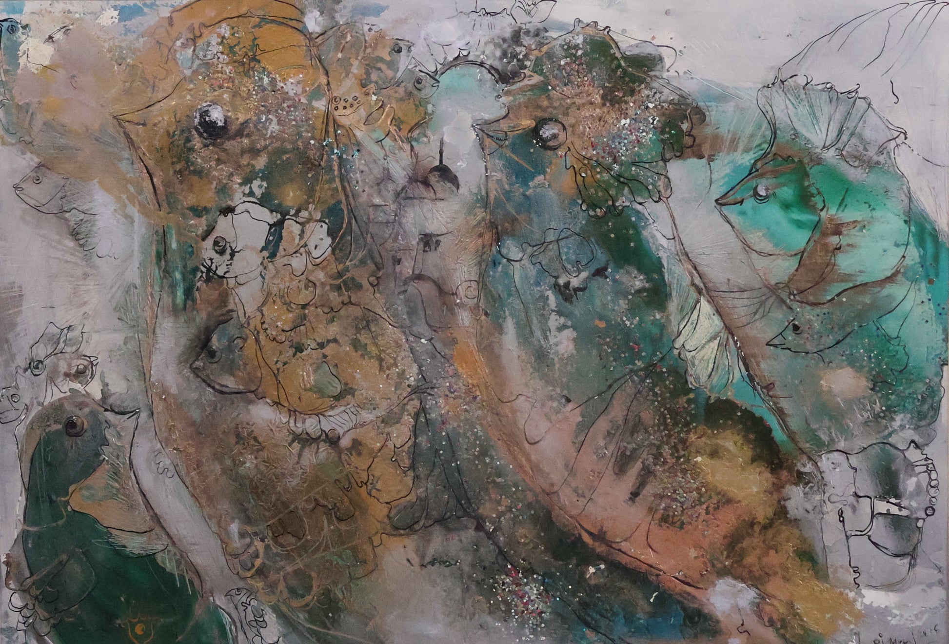 Typisch für Meusers Werk ist die Verbindung von Natur und Mythos: Die Wasserwesen wirken nicht zoologisch, sondern seelisch. Jeder Fisch trägt ein eigenes inneres Leuchten, während die goldenen Partikel wie Energiepunkte im Bild schimmern – Spuren eines unsichtbaren Lebensstroms.