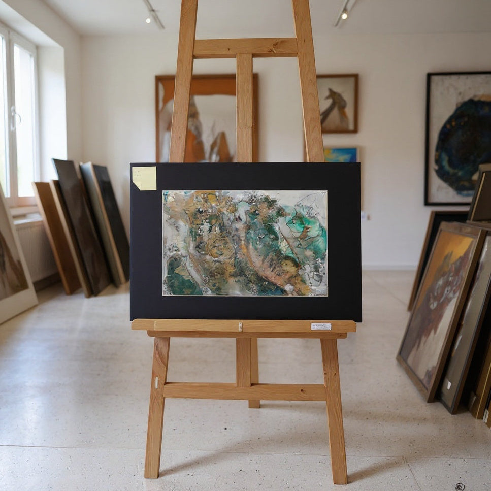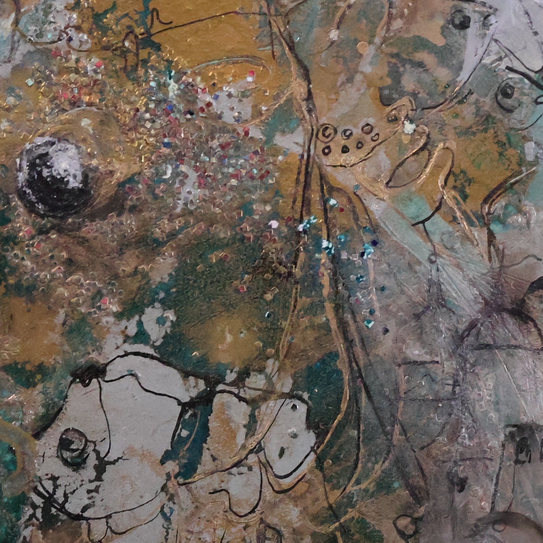 Die schichtreiche Oberfläche – Schaben, Lasuren, Pigmentzüge – lässt das Bild vibrieren. Gold- und Grüntöne legen sich über- und ineinander, als würde man durch wechselnde Wasserschichten blicken: vom glitzernden Sonnenrand an der Oberfläche bis hinunter in die kühlen Tiefen, wo sich organische Strukturen wie Korallen, Algen und Lebewesen geheimnisvoll miteinander verbinden.