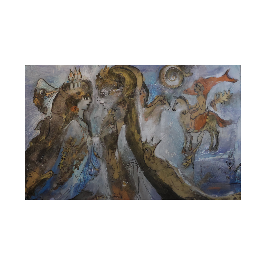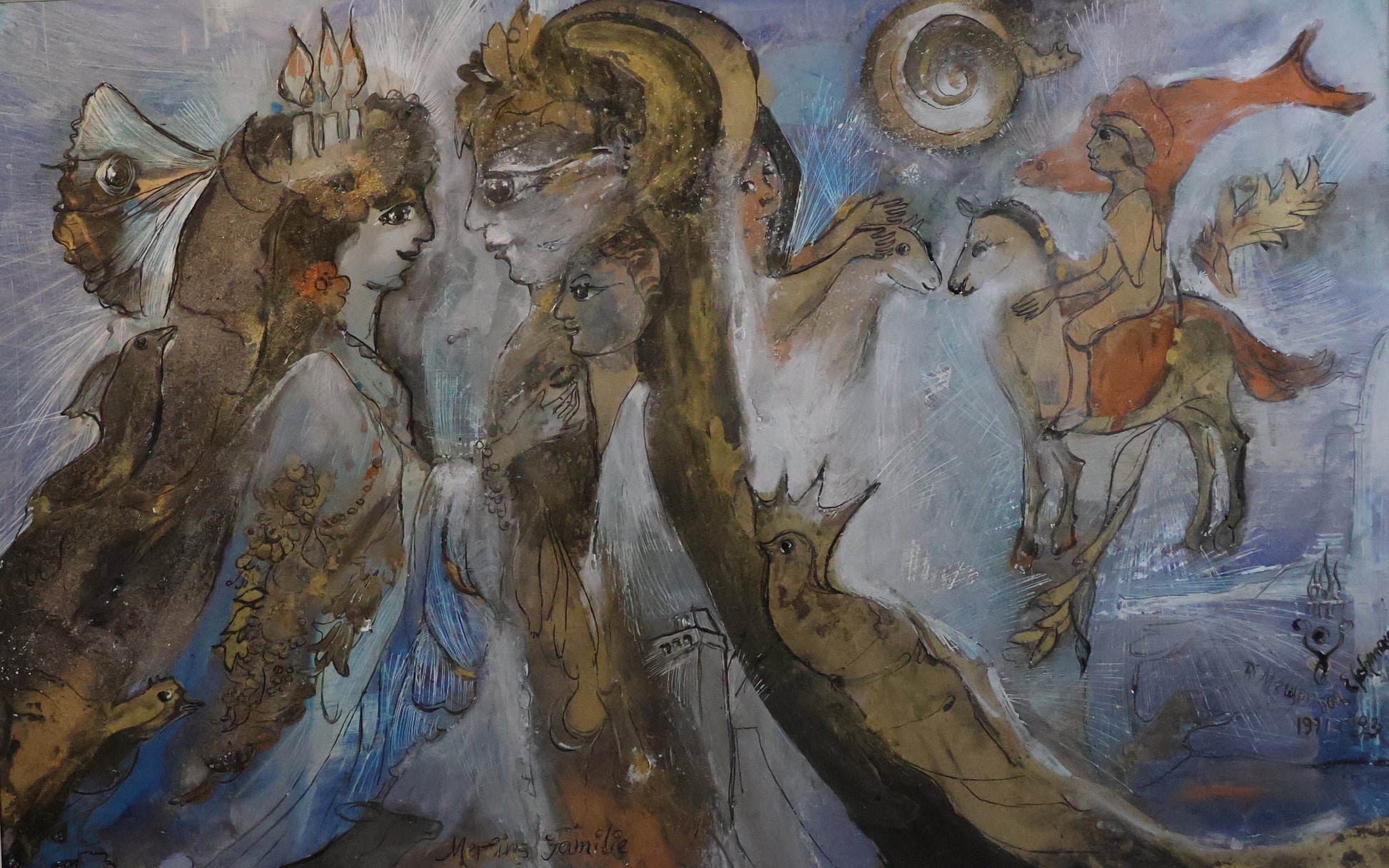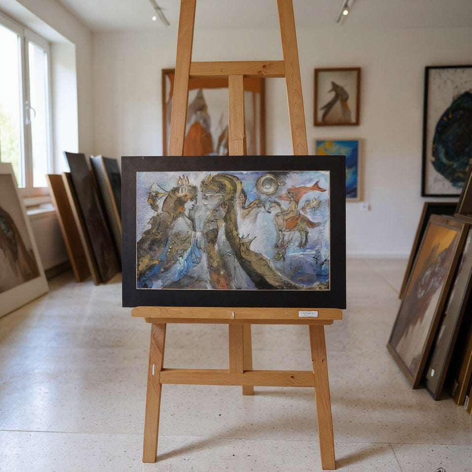 Goldene Pigmente, transparente Sgraffito-Schichten und die weichen Übergänge zwischen Figur und Umgebung lassen das Gemälde leuchten. „Merlins Familie“ ist nicht einfach ein Bild – es ist eine Chronik, ein Mythos, ein leises Epos über Herkunft, Schutz, Mut und die Kraft verborgener Welten.