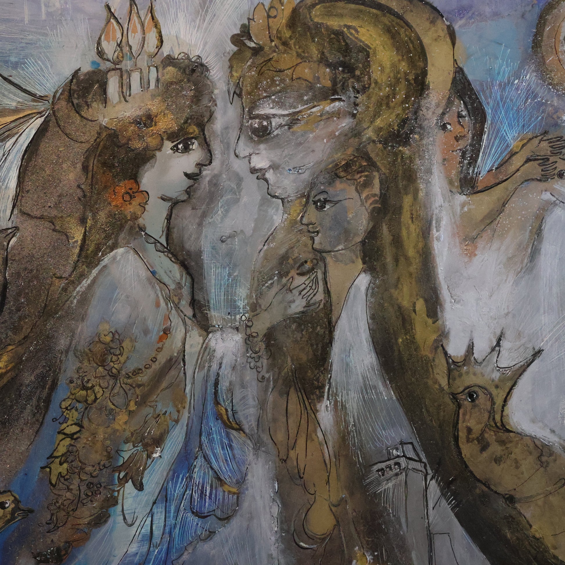 Im Zentrum stehen die Figuren, die Meuser als „Merlins Familie“ bezeichnet: nicht im wörtlichen Sinne, sondern als poetische Verwandtschaft von Lichtwesen, Schutzgestalten und Naturgeistern. Ihre Körper scheinen aus Gold, Ocker und zarten Blaugraden verwoben – halb Mensch, halb Mythos.