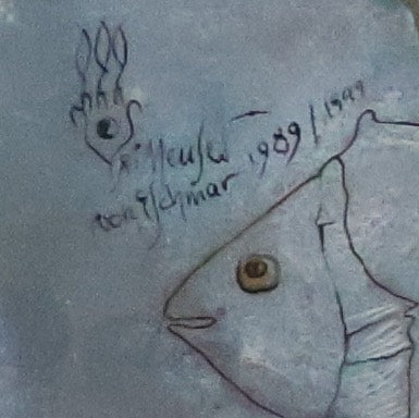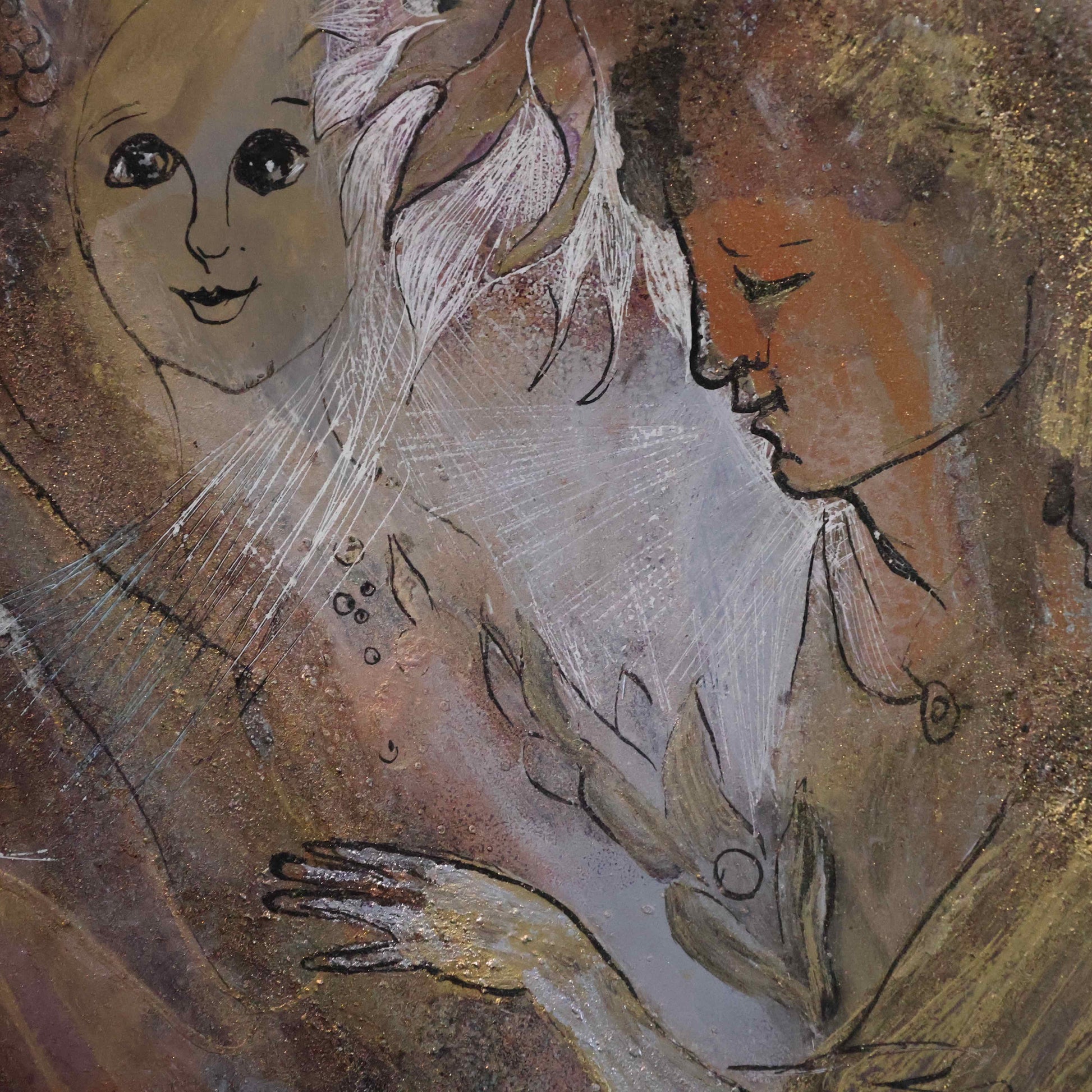 Mit der Mono Sgraffito-Technik gelang es Ri Meuser von Eschmar, Schichten von Symbolik und Erzählung aufzubauen. „Märchenhafte Gesichter“ ist ein Unikat für Sammler, die die Verbindung aus Fantasie, Symbolkraft und intensiver Farbgestaltung schätzen.