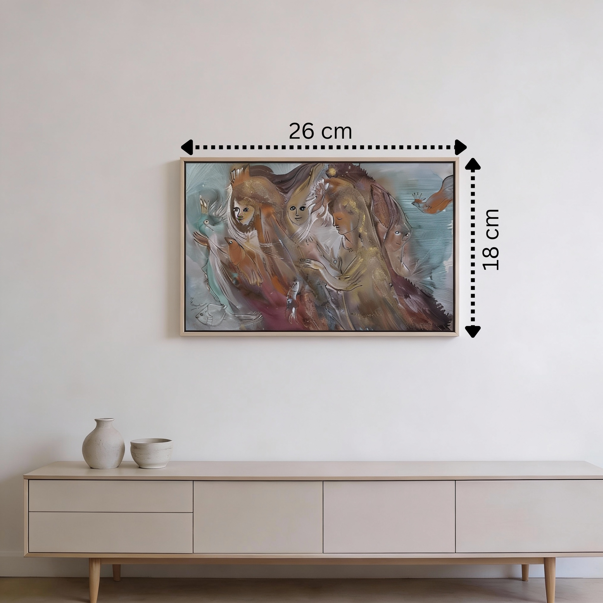 Die Farbpalette aus Türkis, Violett und Gold schafft eine lebendige, fast übernatürliche Atmosphäre. Goldene Strukturen schimmern zwischen den Figuren und verleihen dem Werk eine besondere Tiefe und Bewegung.