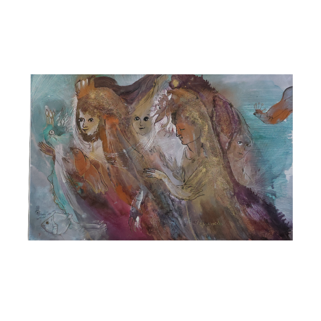 Das Originalgemälde „Märchenhafte Gesichter" zeigt eine faszinierende Komposition, in der sich menschliche und tierische Gestalten ineinander verweben. Mehrere Gesichter blicken den Betrachter an – geheimnisvoll, ernst und zugleich voller Poesie. Zwischen ihnen tauchen Fische und mythische Wesen auf, die das Bild in eine Traumwelt versetzen.