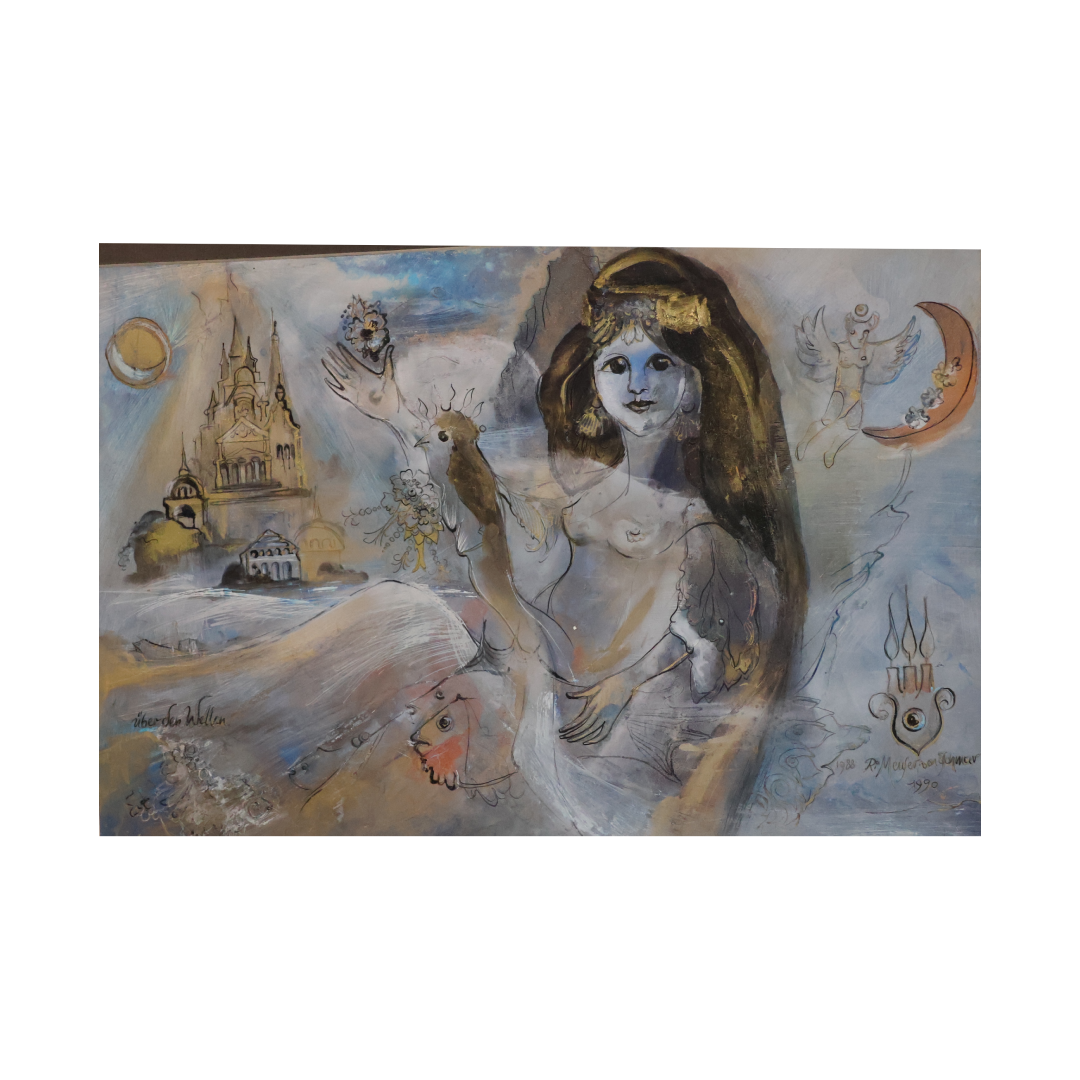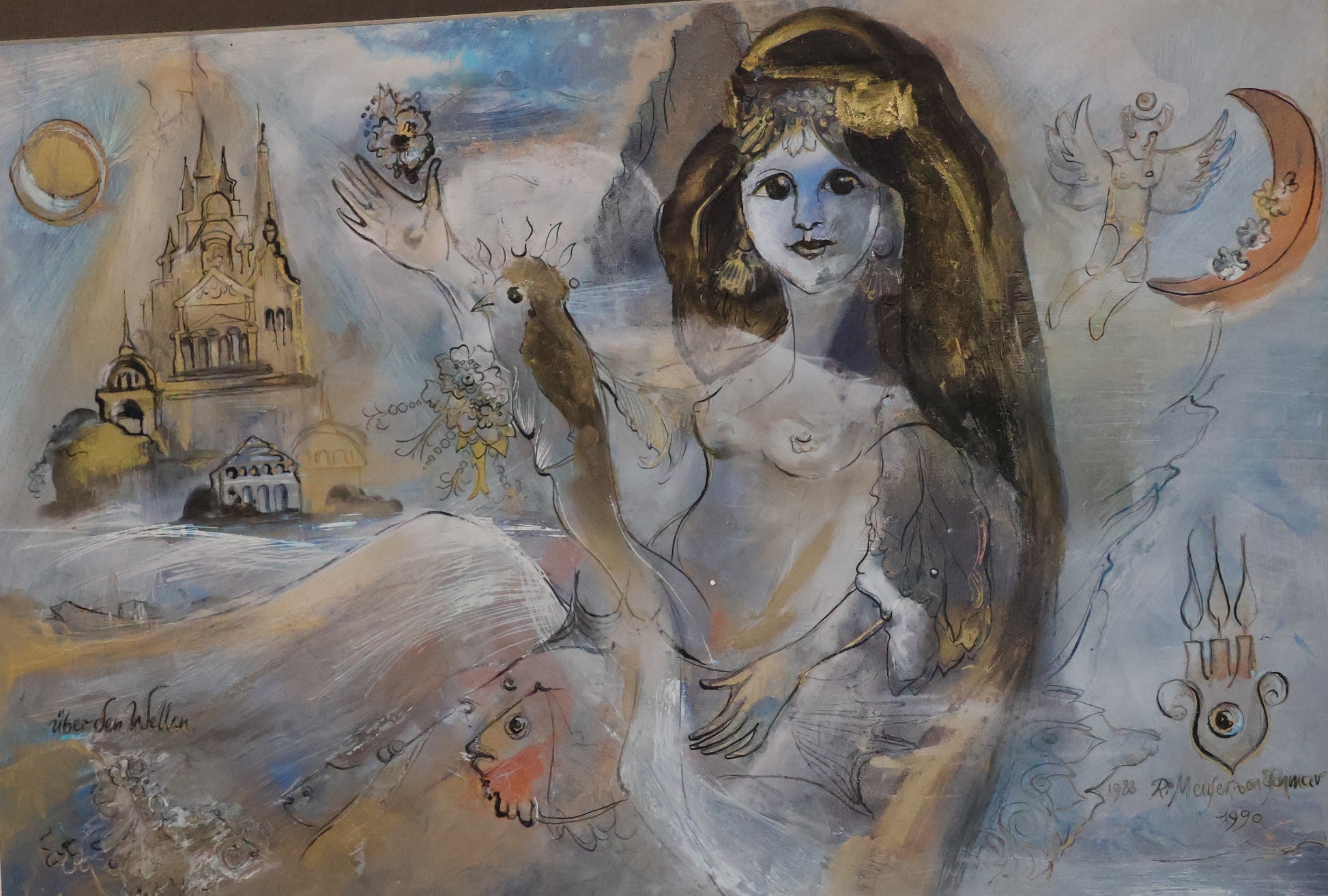 Die Farben changieren zwischen zarten Grau-Blau-Nuancen, goldenen Reflexen und weichen Pastelltönen, die dem Gemälde Leichtigkeit verleihen, während die Figuren dennoch eine eindringliche Präsenz entfalten. In der rechten unteren Ecke finden sich die Signatur „Ri Meuser von Eschmar“ sowie die Jahreszahl 1990, was dieses Werk eindeutig verortet.