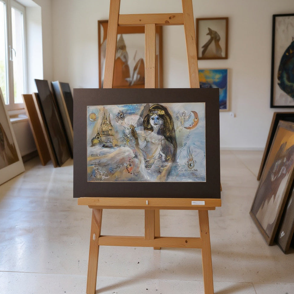 Dieses Werk trägt den Titel „Über den Wellen“ und zeigt die unverkennbare Handschrift von Ri Meuser von Eschmar. Im Zentrum erhebt sich eine anmutige Frauengestalt mit dunklem, reich verziertem Haar, in dem goldene Akzente aufleuchten. Ihre Haut ist in kühlen, fast silbrig-blauen Tönen gehalten, wodurch sie eine geheimnisvolle Aura erhält. Neben ihr flattert ein Vogel, der wie ein Bote wirkt und Blumen im Schnabel trägt, während ihre Hand ebenfalls einen Strauß emporhält – Sinnbilder für Hoffnung, Leben und Verbindung.