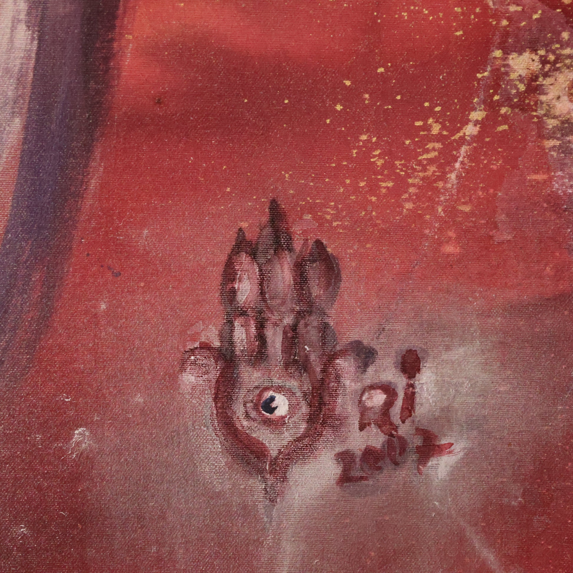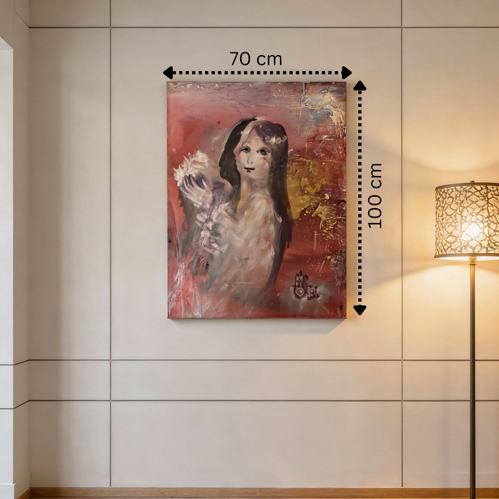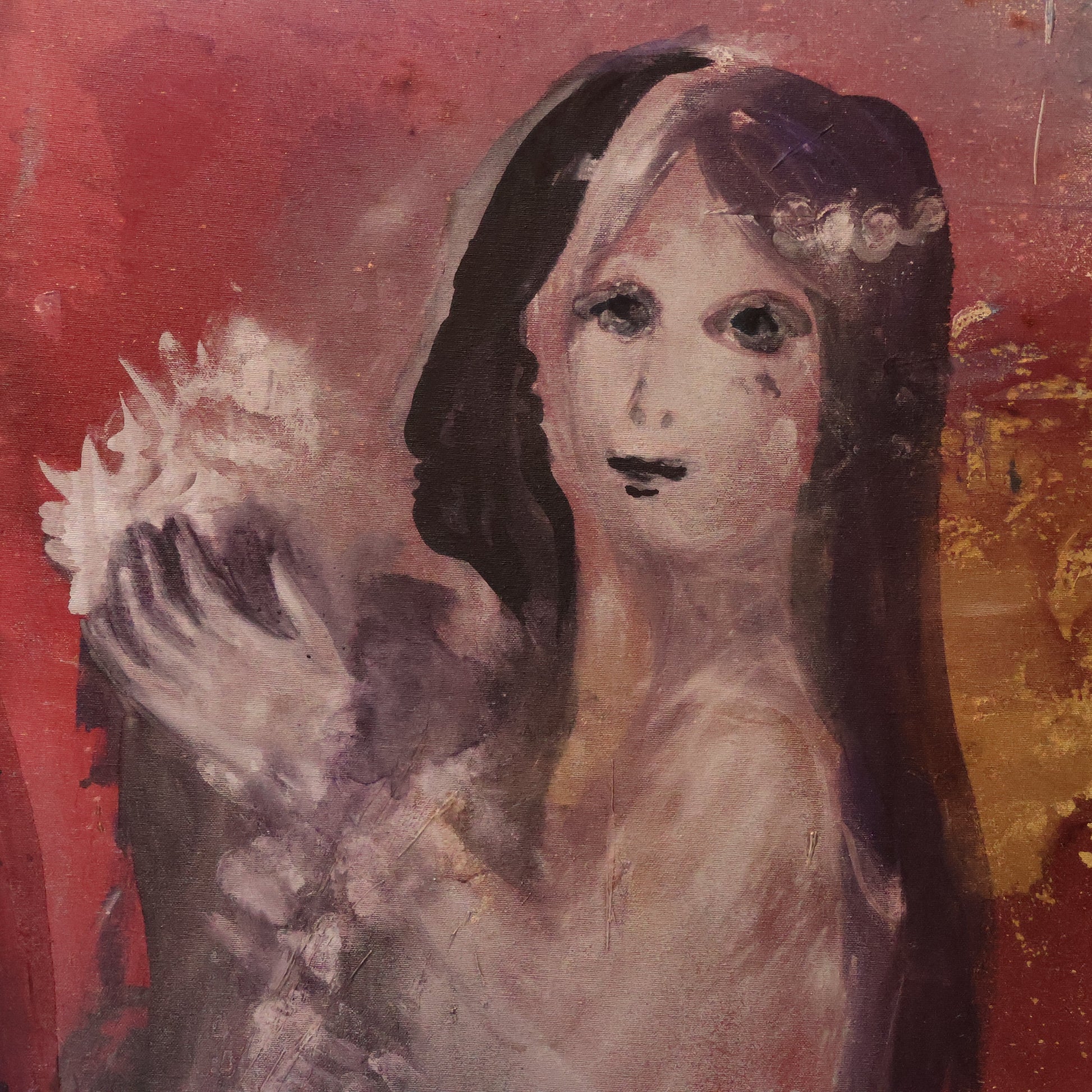 Der Hintergrund in warmen Rot- und Goldtönen schafft einen leuchtenden Kontrast zur hellen Figur. Die Struktur des Malgrundes, mit aufgerauten und schimmernden Flächen, verleiht dem Bild eine fast ikonische Wirkung. Es wirkt, als entstehe das Mädchen selbst aus dem Licht der Farben – ein Übergang zwischen Traum und Realität.