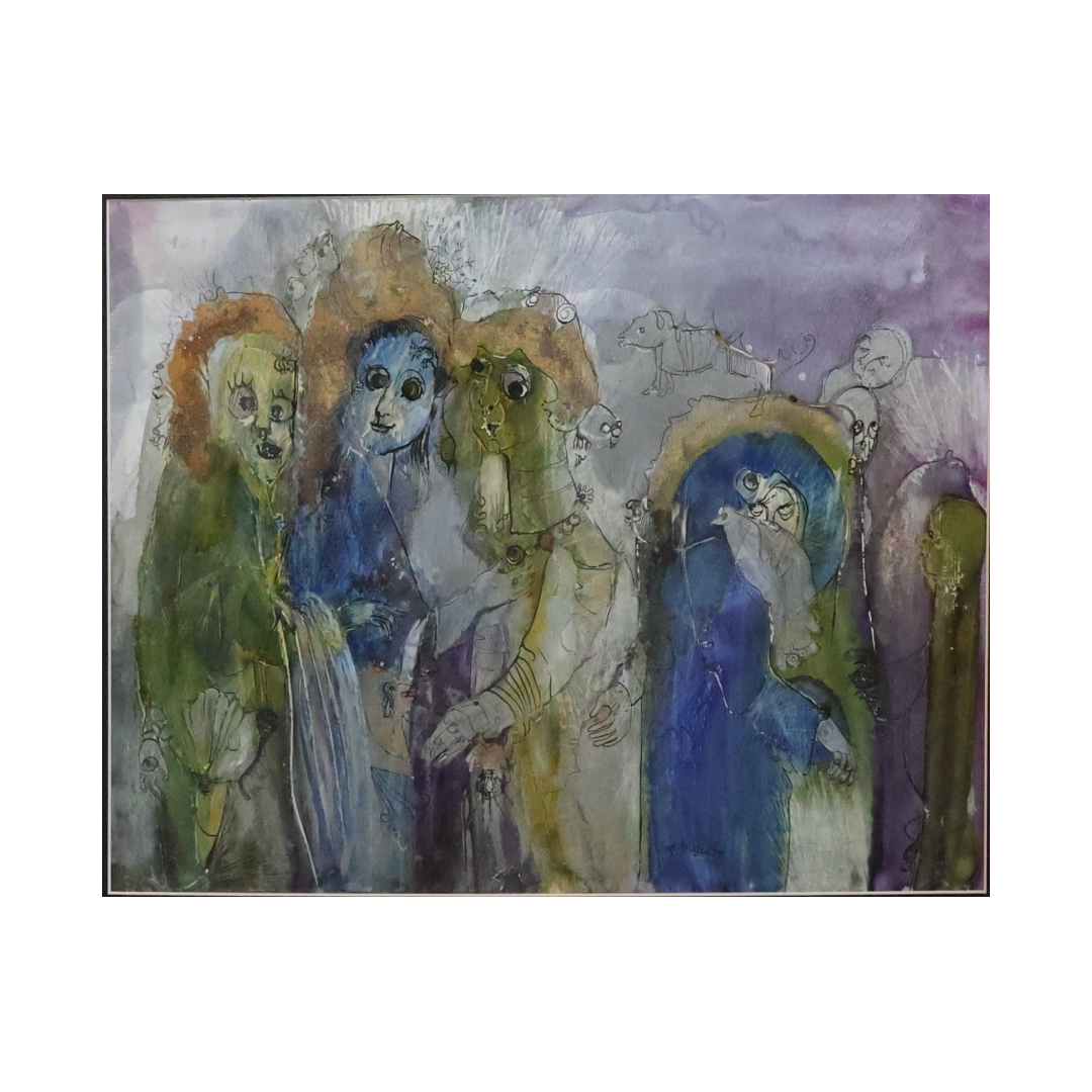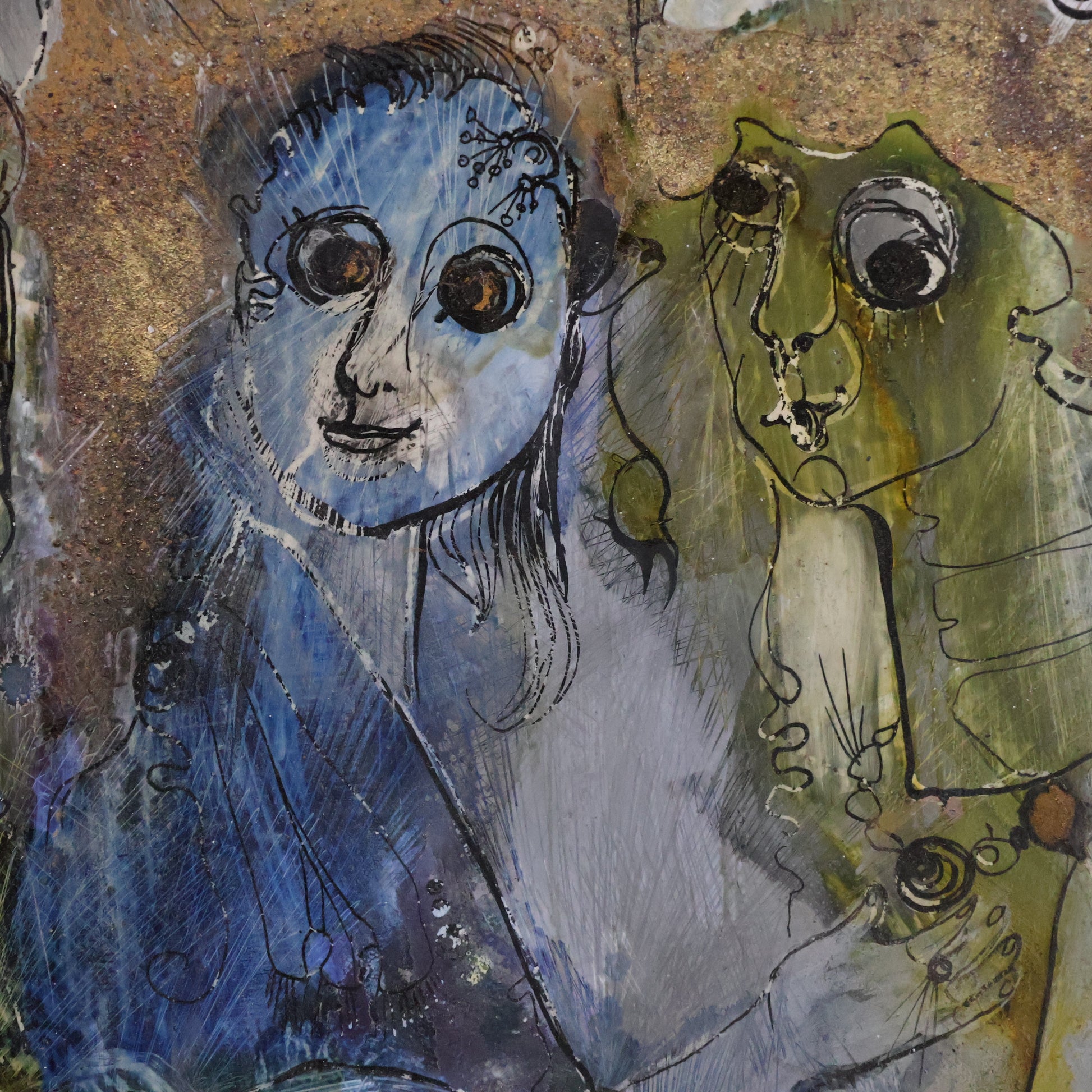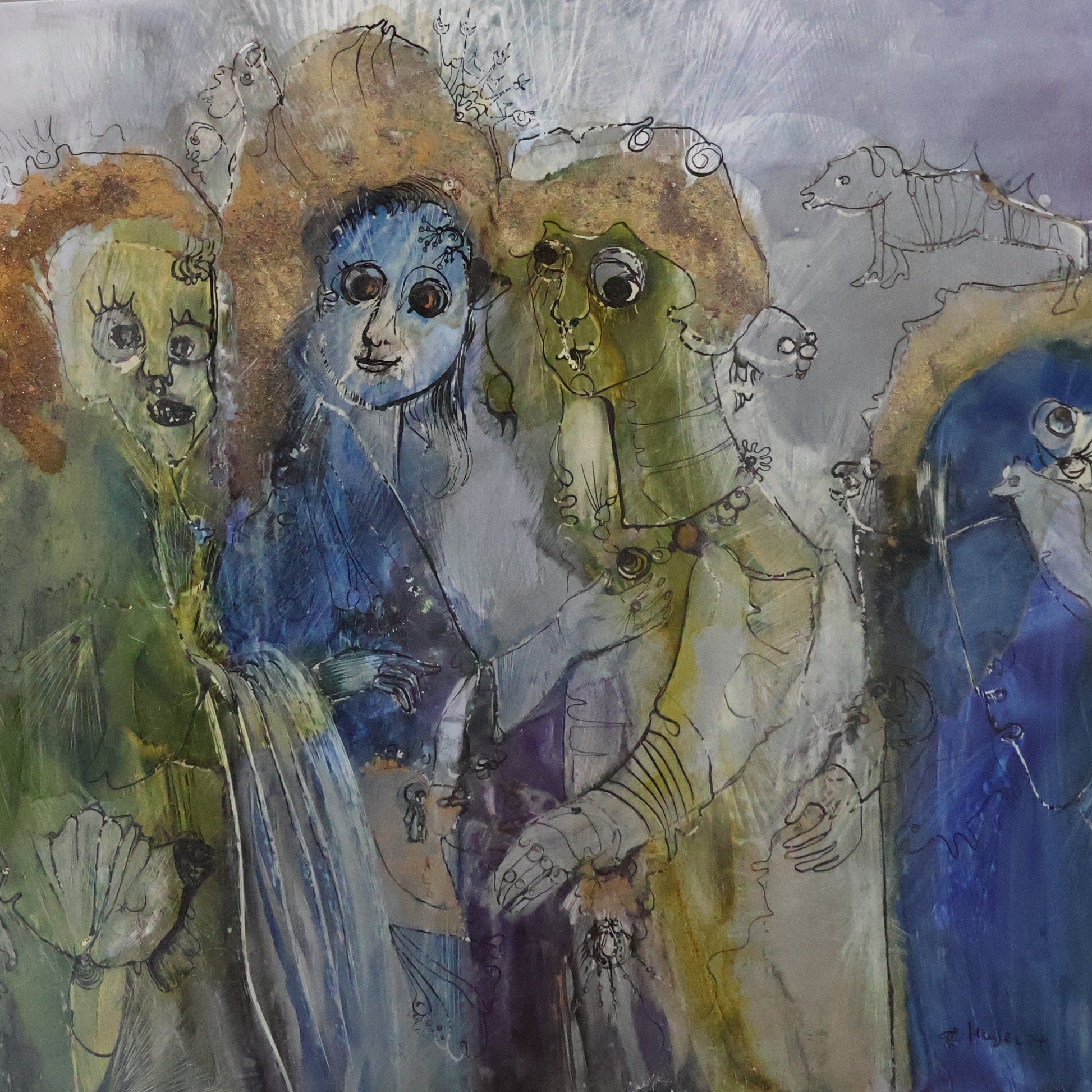 In diesem eindrucksvollen Originalgemälde von Ri Meuser von Eschmar offenbart sich eine geheimnisvolle Szene: Mehrere Gestalten – teils in leuchtendem Blau, teils in gedämpften Grüntönen – stehen im Kreis und scheinen in stummer Zwiesprache verbunden. Ihre großen, durchdringenden Augen wirken wie Spiegel einer anderen Welt, während feine Linienzeichnungen kleine Tiere, Fabelwesen und unsichtbare Gedanken sichtbar machen.