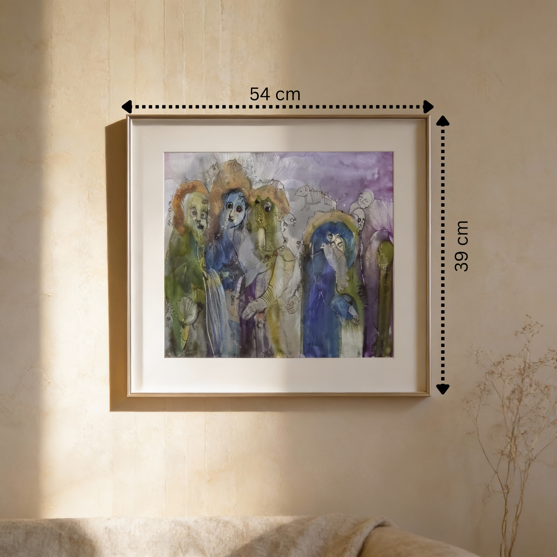 Die Szene erinnert an ein Seltsames Familientreffen: Vielleicht beraten sich hier alte Seherinnen, vielleicht versammeln sich Fabelwesen, um über die Zukunft der Welt zu sprechen. Im Hintergrund erscheinen schemenhaft Tiere – halb real, halb mythisch – die den Dialog der Figuren um eine weitere Dimension bereichern.