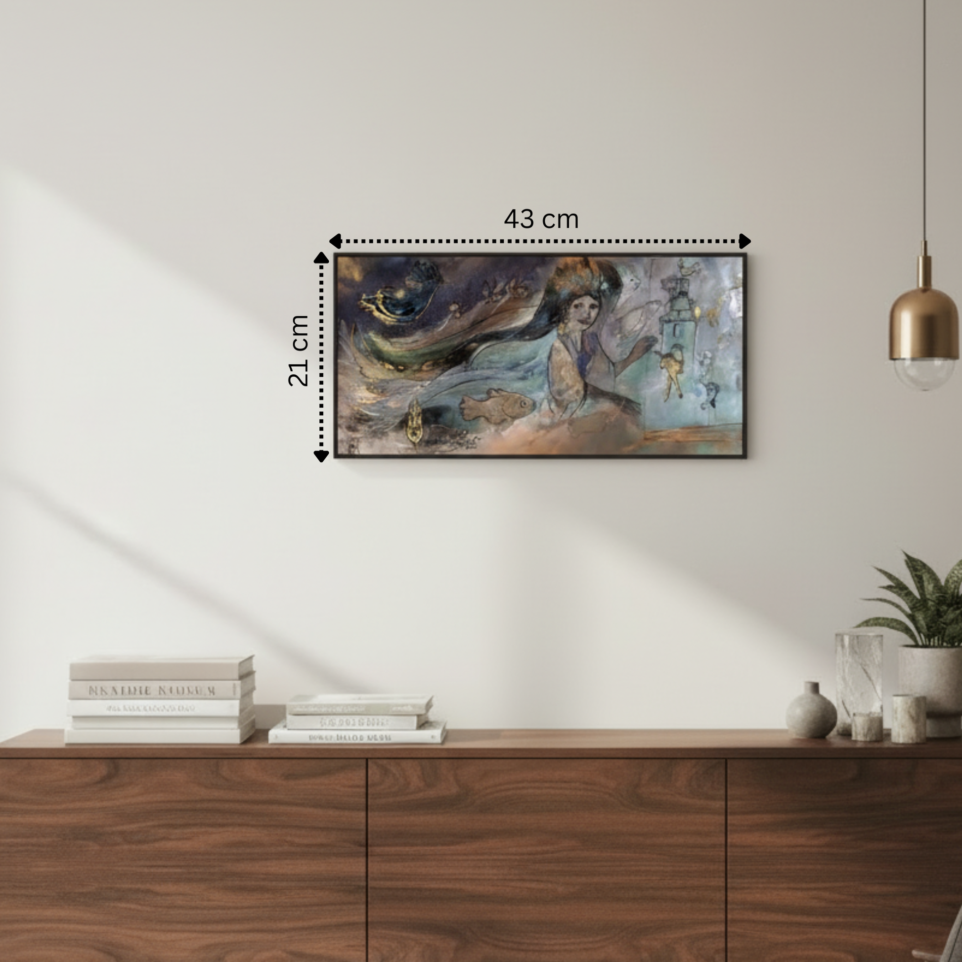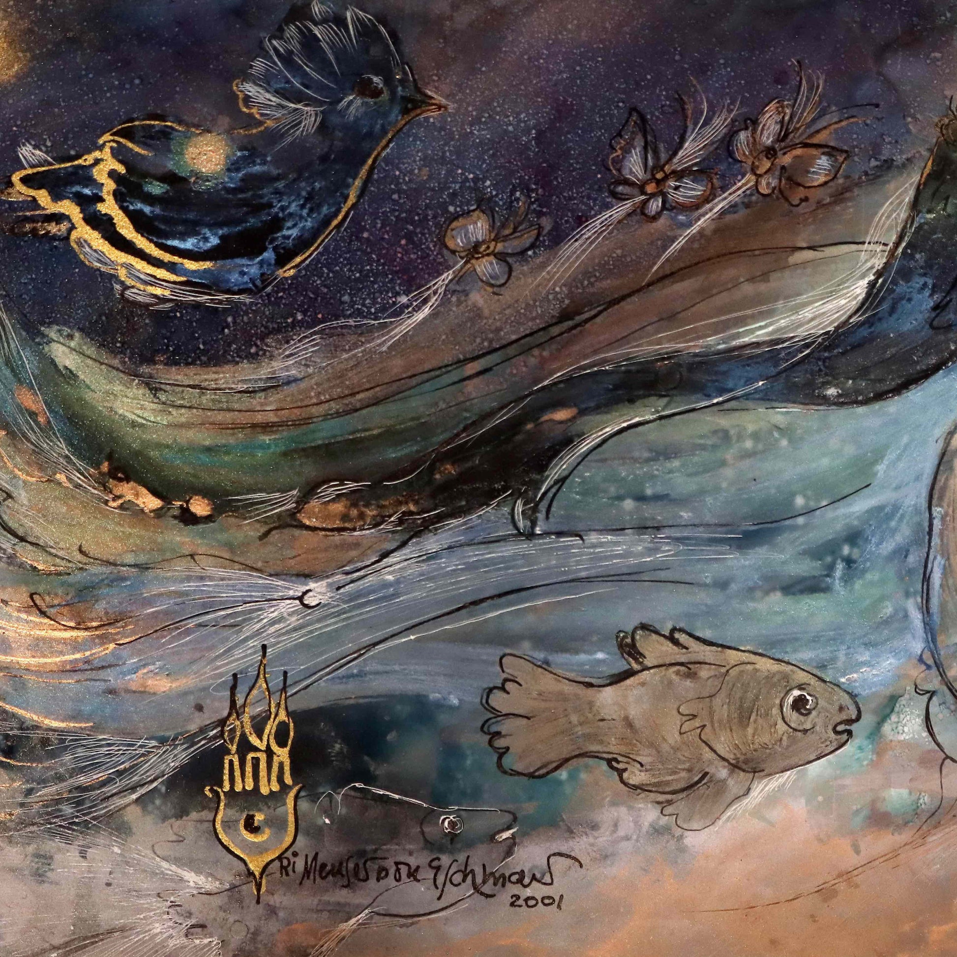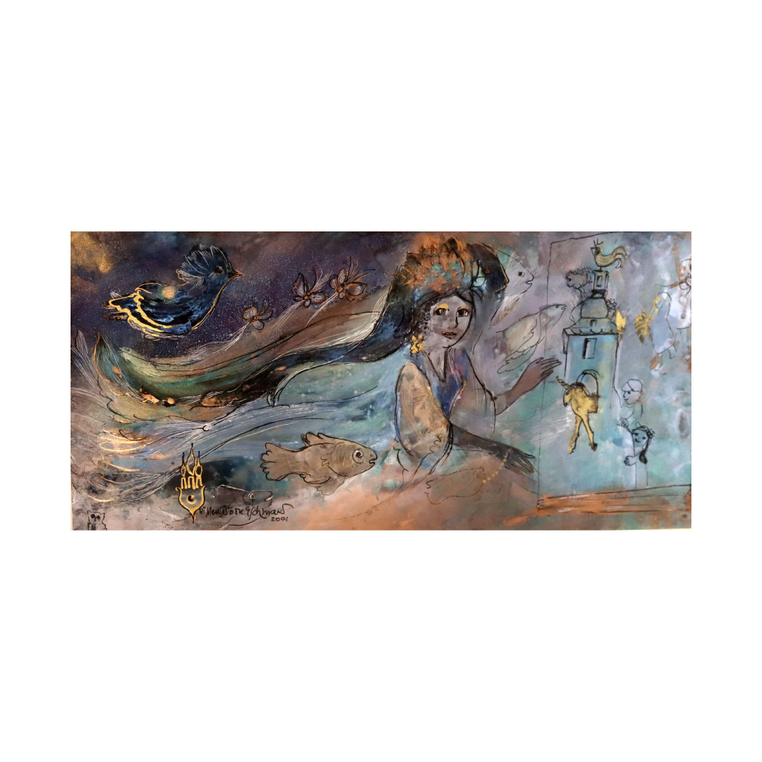 Goldene Reflexe tanzen über die metallisch glänzende Oberfläche, während feine Linien die Grenzen zwischen Traum und Realität auflösen. Alles scheint miteinander verwoben – Wasser, Luft, Tier und Mensch – in einem harmonischen Spiel, das an alte Legenden erinnert und doch zeitlos wirkt.