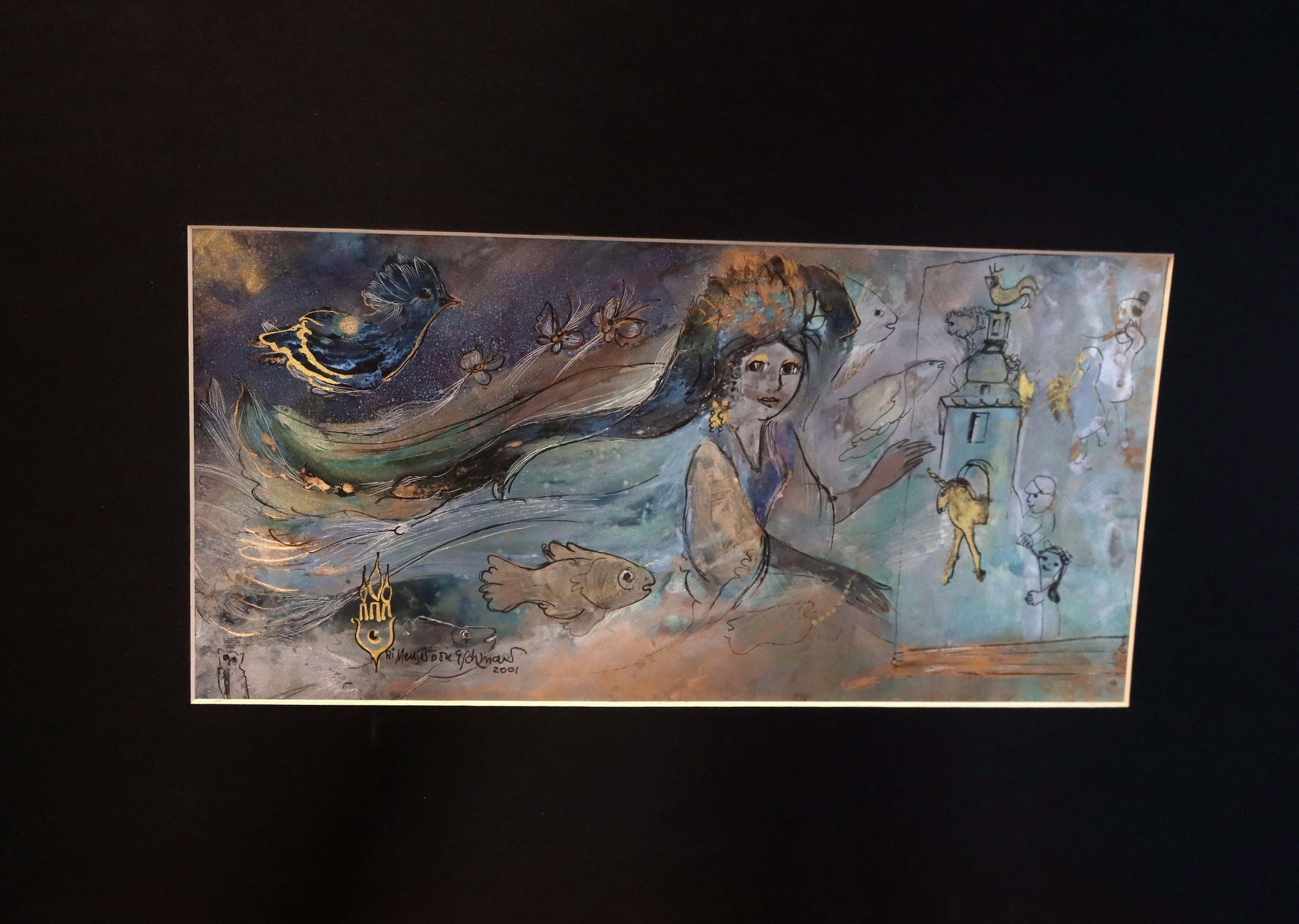 Die Szene zeigt eine geheimnisvolle Dame mit fließendem, blauschimmerndem Haar, das in Bewegung scheint – als würde es vom Wind einer anderen Welt getragen. Neben ihr schwimmt ein Fisch, über ihr fliegen Vögel, und im Hintergrund erhebt sich die zarte Silhouette der Burg Wissem – ein Ort, der für die Künstlerin eine besondere persönliche Bedeutung hatte. An ihrer Seite: ein Einhorn, Symbol für Reinheit, Unschuld und das Göttliche im Irdischen.