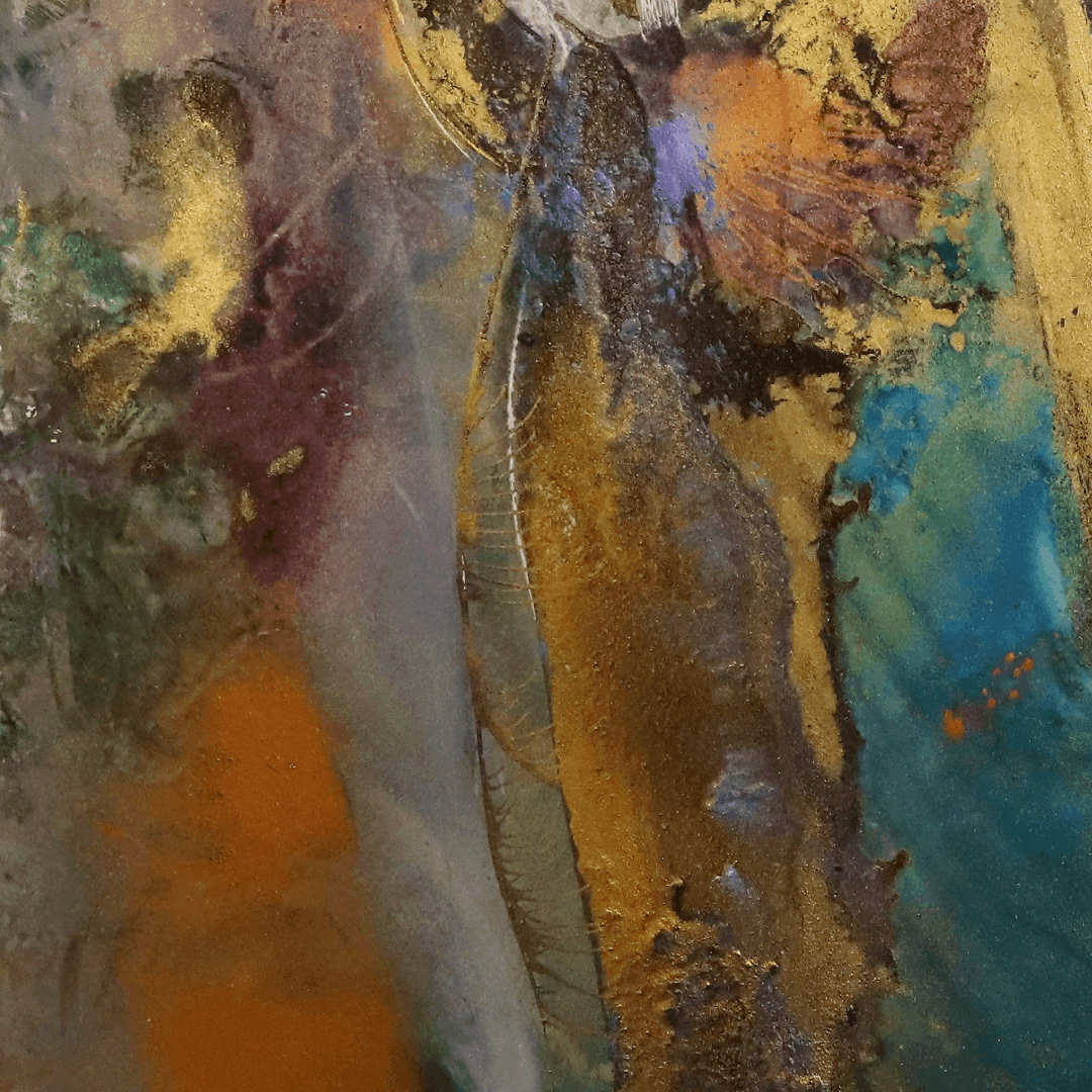 „Goldene Dame“ aus den Jahren 1998–2000 zeigt eine weibliche Figur, die sich aus einem vielschichtigen Farb- und Symbolraum heraus erhebt. Die Gestalt wirkt zugleich präsent und entrückt, als würde sie zwischen Erscheinung und Erinnerung stehen. Ihr Blick ist ruhig, fast wissend, und richtet sich nicht direkt nach außen, sondern scheint in einen inneren Raum zu führen. Umgeben von warmen Goldtönen, erdigen Schichten und kühlen Blau- und Grüntönen entsteht eine Atmosphäre von Schutz und Offenheit zugleich. Die angedeutete Kopfform mit einem leuchtenden, beinahe haloartigen Element verleiht der Figur eine sakrale Anmutung, ohne sie eindeutig festzulegen.