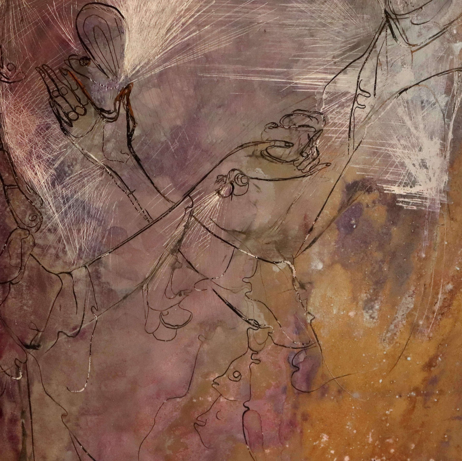 Das Werk lebt von den typischen Kontrasten Meusers: zarte Violett- und Grautöne, durchzogen von goldenen Akzenten, die sich über die Oberfläche ziehen wie Erinnerungen an vergangene Träume. Durch das Schichten, Kratzen und Neu-Lasieren der Farbe entsteht eine Oberfläche von fast magischer Tiefe – die Mono Sgraffito-Technik wird hier zum Träger innerer Bewegung.