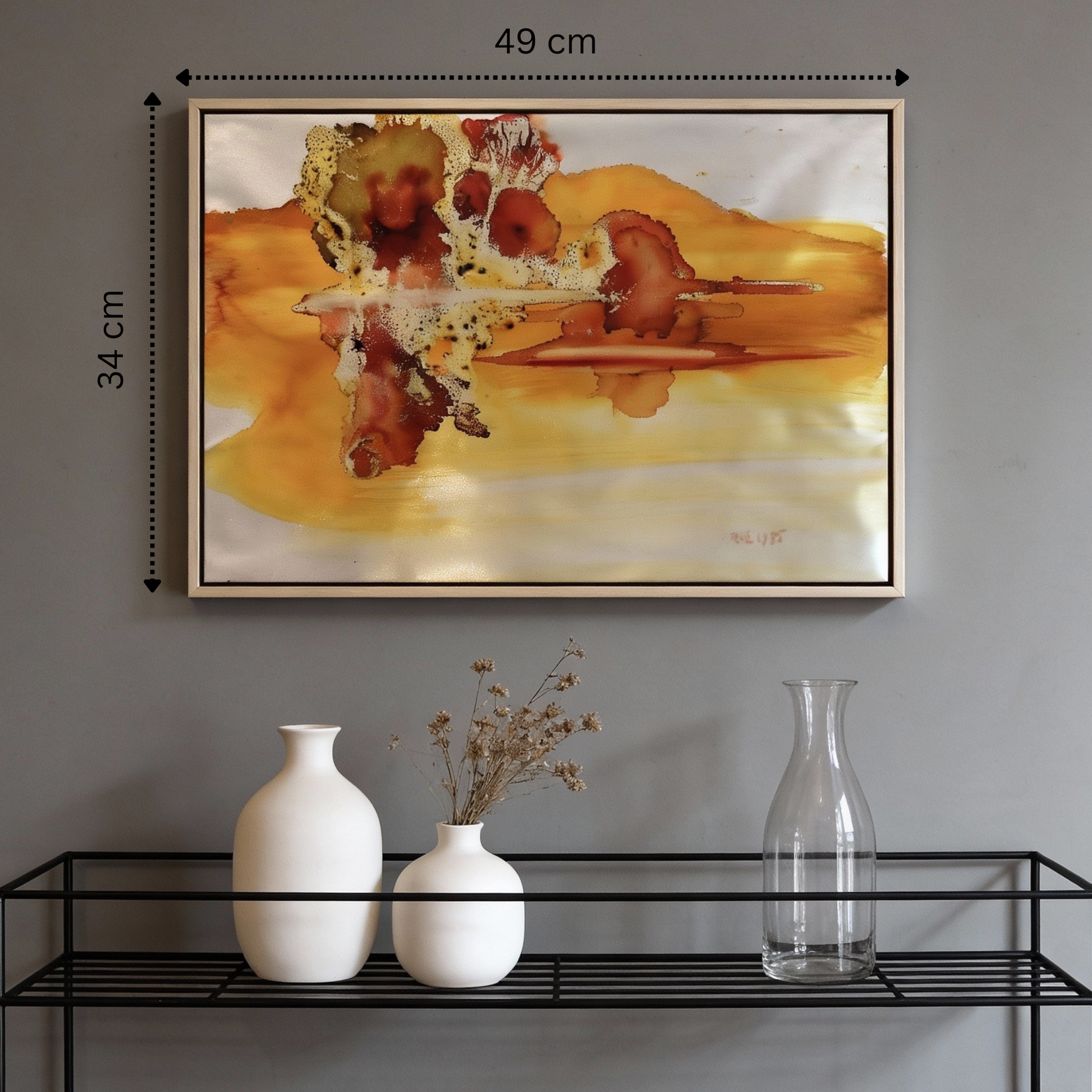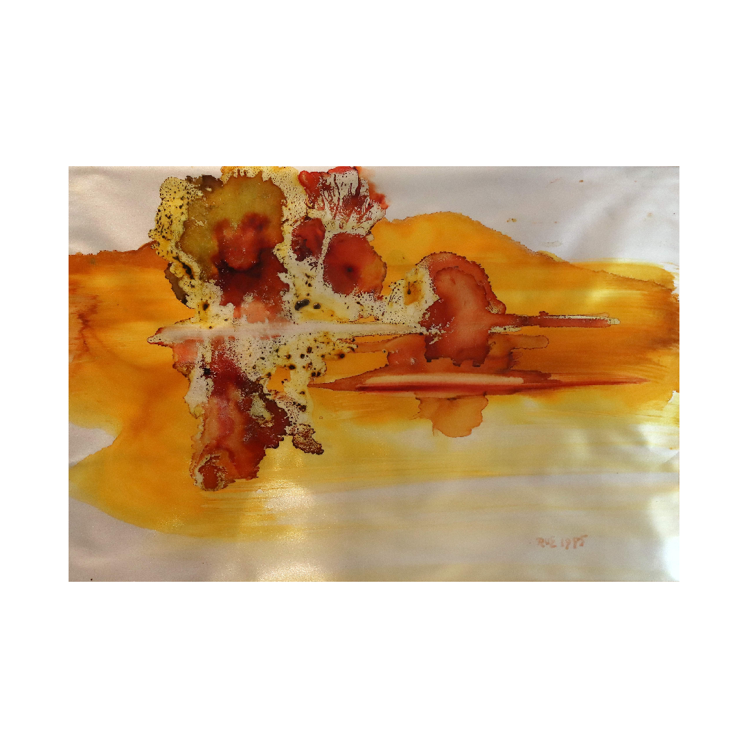 In „Herbstliche Landschaft“ aus dem Jahr 1985 entführt Prof. Ri Meuser von Eschmar den Betrachter in eine leuchtende Komposition aus Gold-, Kupfer- und Silbertönen – ein poetisches Sinnbild für Vergänglichkeit und Neubeginn. Auf einer hauchdünnen Silber-Puran-Folie, die sie in einer eigens entwickelten Technik als Malgrund nutzte, schichtet die Künstlerin Farbpigmente, kratzt sie teilweise wieder frei und trägt neue Lasuren auf. So entsteht eine unverwechselbare Tiefenwirkung, die das Licht reflektiert und dem Bild eine fast magische Transparenz verleiht.
