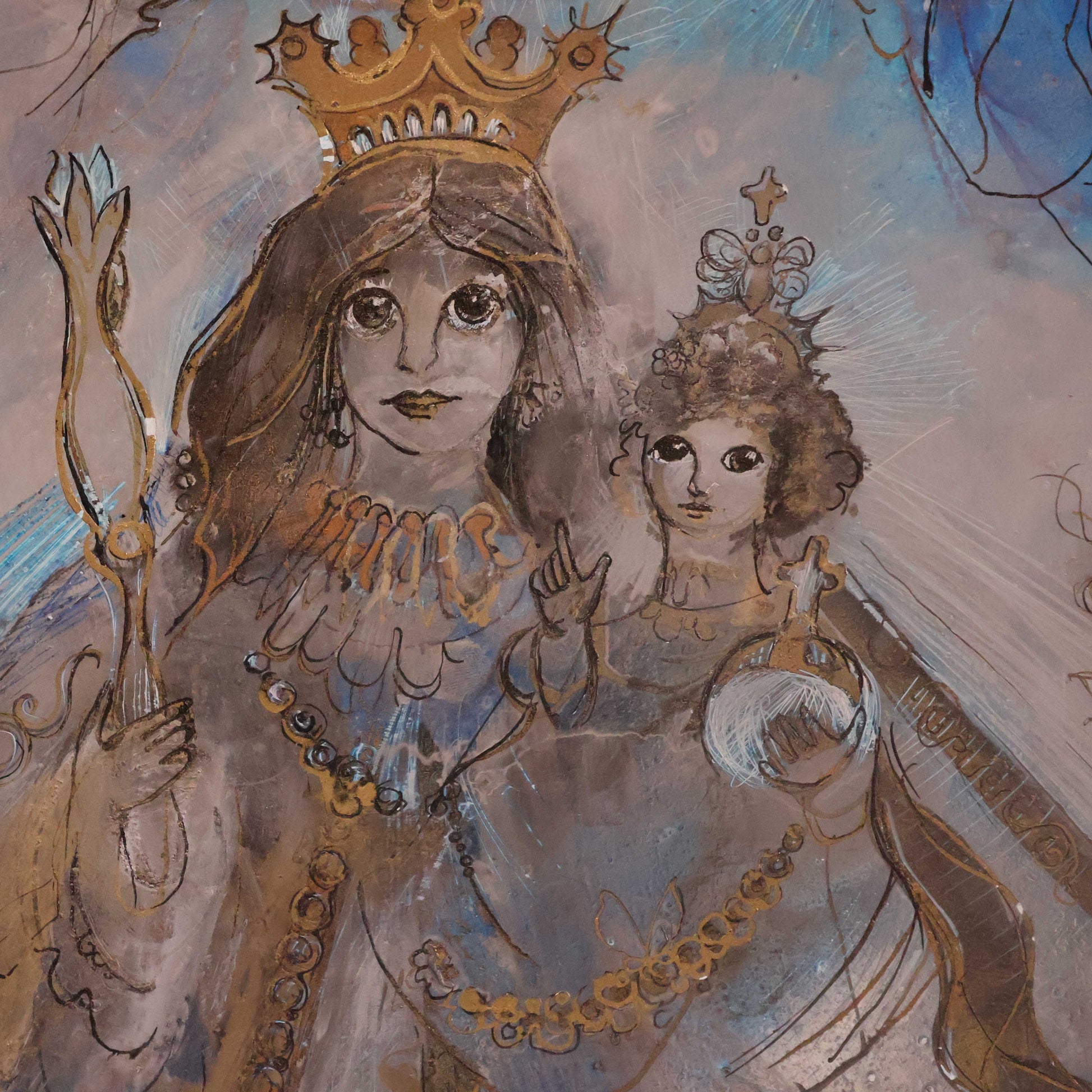 In ihrer charakteristischen Mono Sgraffito-Technik überlagert Meuser feinste Pigmentschichten mit Gravuren und goldenen Partikeln. So entsteht ein vibrierendes Spiel aus Licht und Struktur – ein Gemälde, das zu atmen scheint. Das Blau der Gewänder steht für Schutz und Reinheit, während die Goldakzente göttliche Energie und Würde symbolisieren.