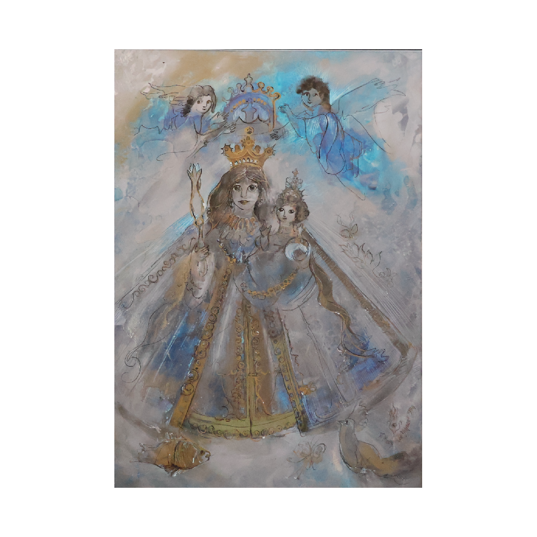 Das Werk „Madonna mit Kind“ zeigt Ri Meuser von Eschmars tiefes Gespür für das Verbindende zwischen Mensch, Seele und Symbol. Eine anmutige Muttergestalt hält ihr Kind im Arm – umgeben von schwebenden Engeln, goldenen Ornamenten und einer leuchtenden Aura aus Blau und Silber. Das Motiv, uralt und universell, erscheint hier in einer zeitlosen, fast kosmischen Interpretation.