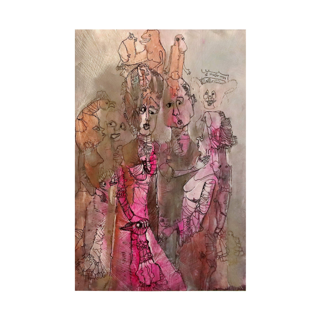 Im Zentrum steht eine Gruppe fantastischer Gestalten: halb Mensch, halb Tier, von eleganten Kleidern und sonderbaren Masken umgeben. Ihre Gesichter wirken zugleich vertraut und fremd – sie scheinen in einem stummen Dialog gefangen, als wüssten sie mehr, als sie sagen dürfen. Goldene und violette Reflexe breiten sich wie ein flirrendes Licht über die Szene, während feine Gravuren Bewegung und Struktur verleihen.