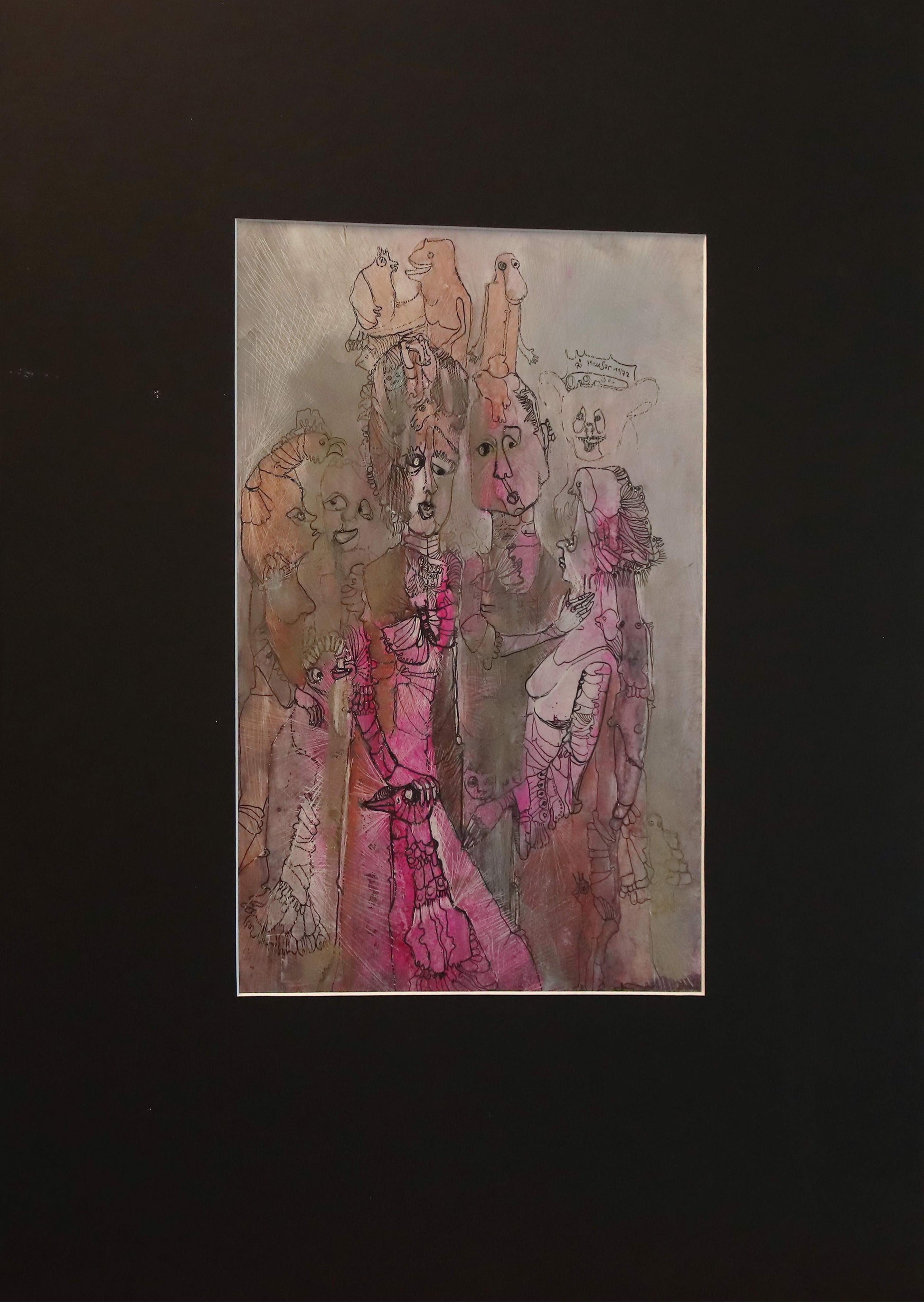 „Seltsame Versammlung“ aus dem Jahr 1972 ist ein Werk voller Rätsel, Bewegung und feiner Ironie – eine Komposition, in der Prof. Ri Meuser von Eschmar ihre außergewöhnliche Beobachtungsgabe und ihr Gespür für das Unbewusste des Menschen offenbart. Entstanden in ihrer eigens entwickelten Mono Sgraffito-Technik, verbindet dieses Werk zeichnerische Präzision mit malerischer Tiefe und metallischer Leuchtkraft.