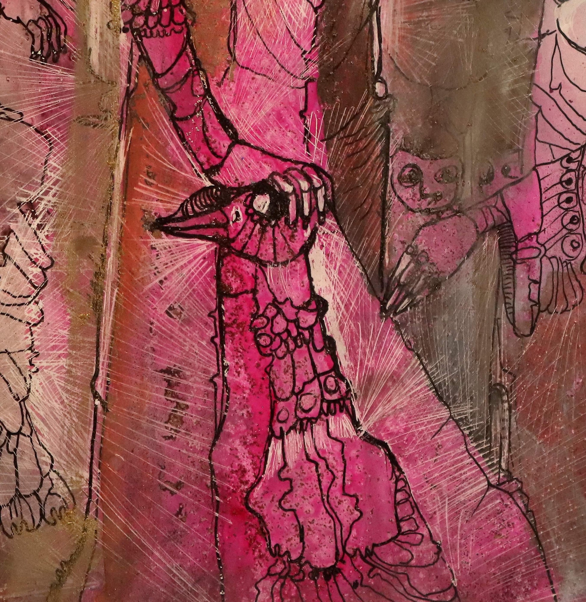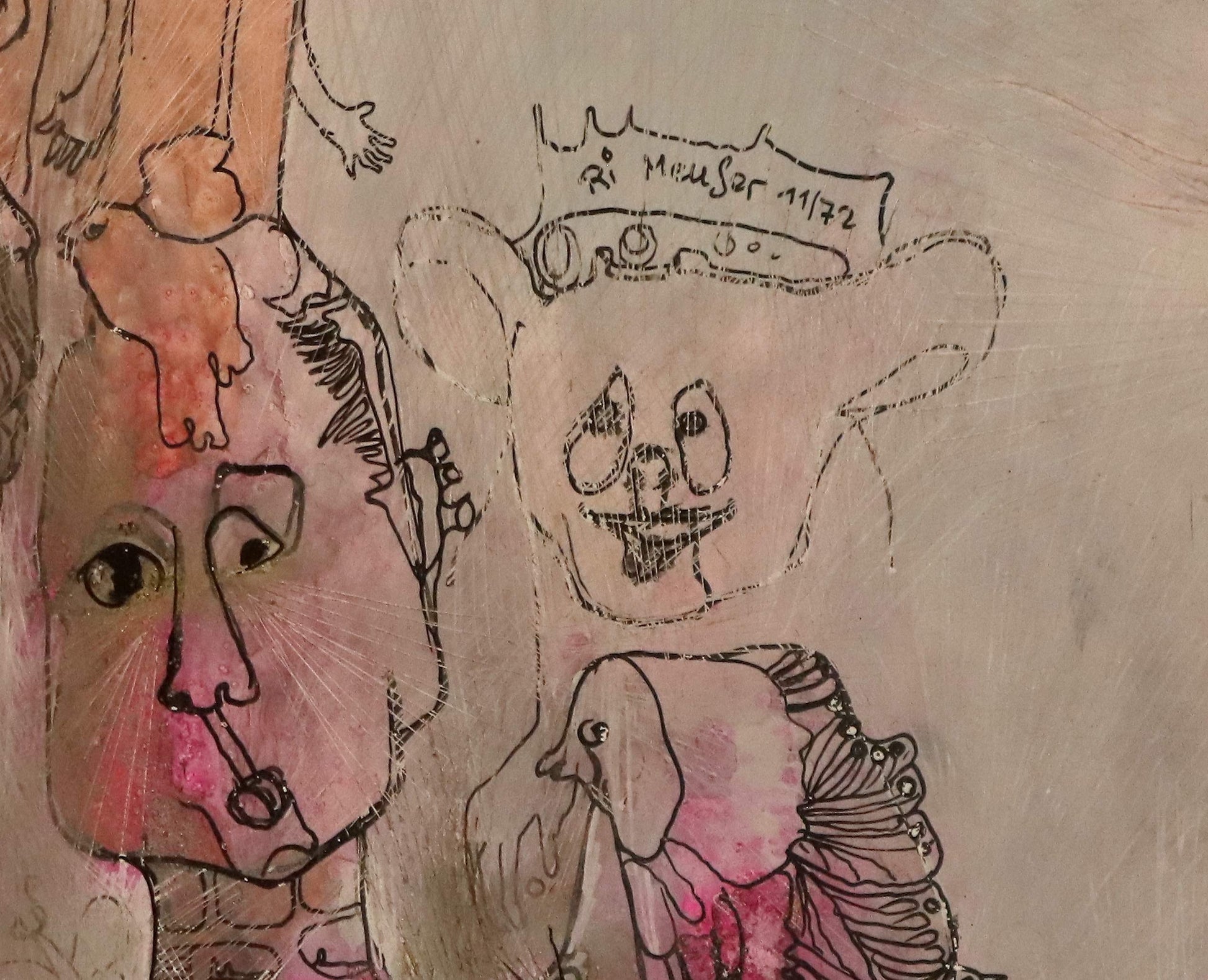 Durch ihre Mono Sgraffito-Technik, bei der Pigmentschichten in bis zu sechzehn Arbeitsgängen aufgetragen, abgekratzt und neu lasiert werden, verleiht Meuser dem Werk eine fast lebendige Oberfläche. Das Licht wandert darüber wie ein stiller Erzähler, der mit jedem Blick neue Figuren und Geschichten offenbart.