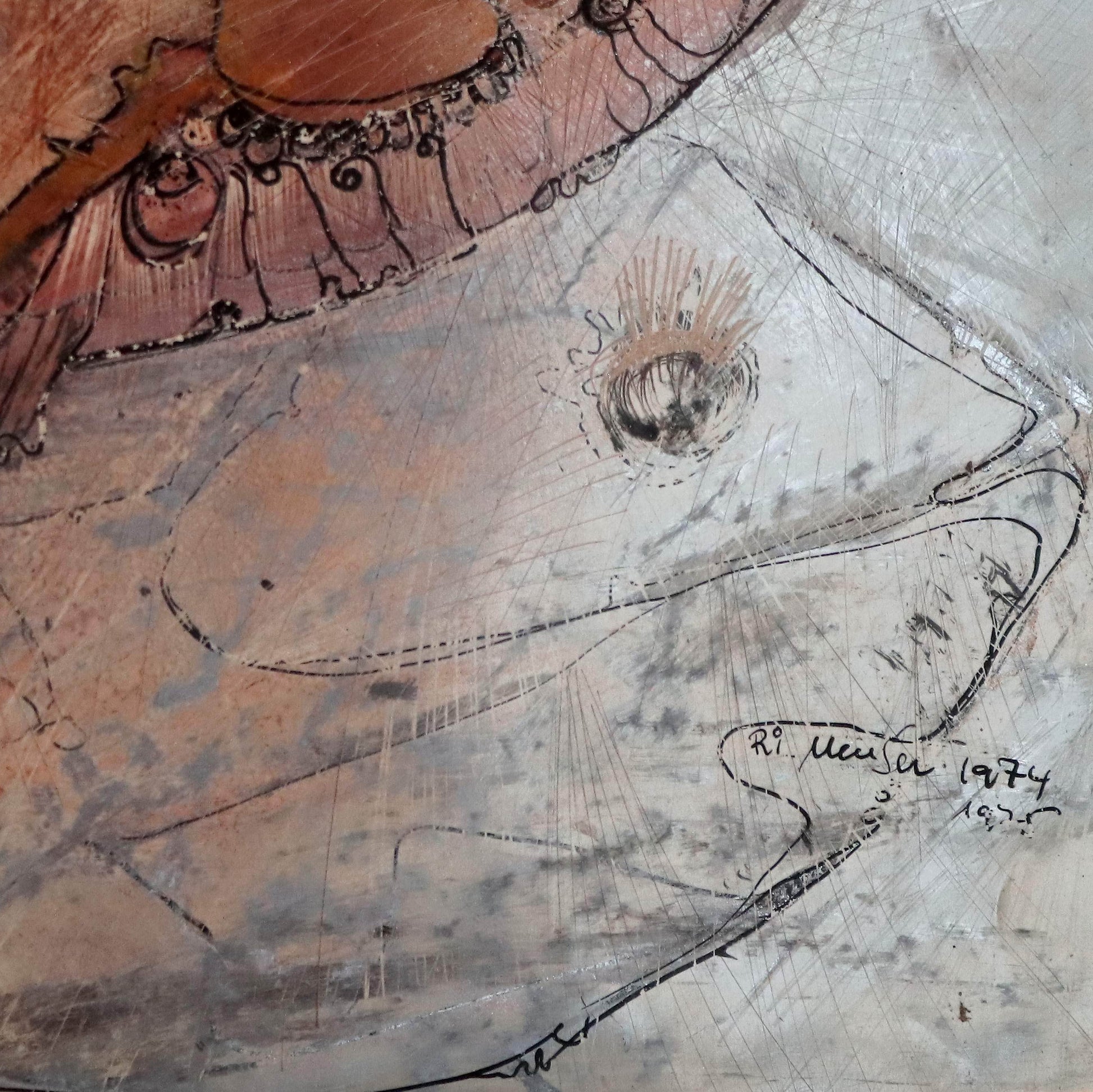 „Seltsamer Fisch“ aus den Jahren 1974–1975 gehört zu den frühen Hauptwerken von Prof. Ri Meuser von Eschmar und markiert eine entscheidende Phase in der Entwicklung ihrer einzigartigen Maltechnik, des Mono Sgraffito. In dieser von ihr selbst erfundenen Methode werden Farbschichten in mehreren Arbeitsgängen aufgetragen, wieder abgekratzt, neu lasiert und mit metallischen Pigmenten veredelt. So entsteht jene charakteristische Leuchtkraft und Tiefenwirkung, die jedes ihrer Werke wie ein lebendiges, atmendes Lichtobjekt erscheinen lässt.