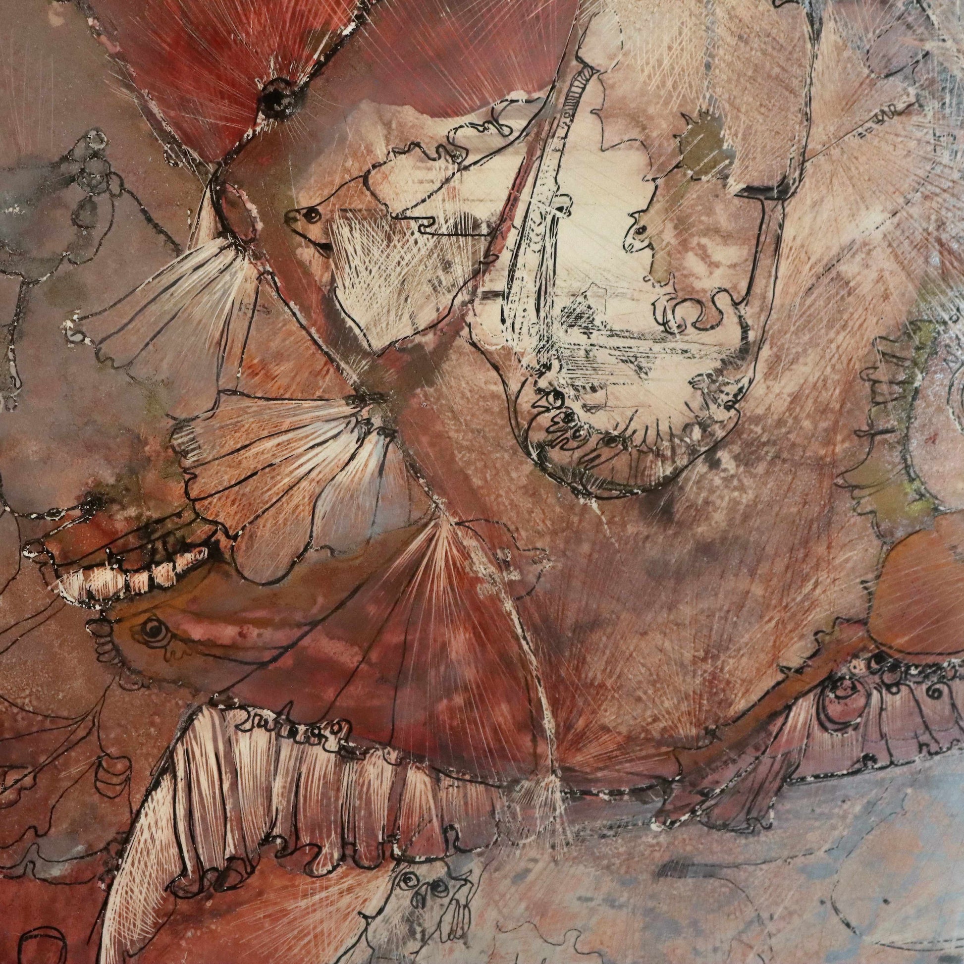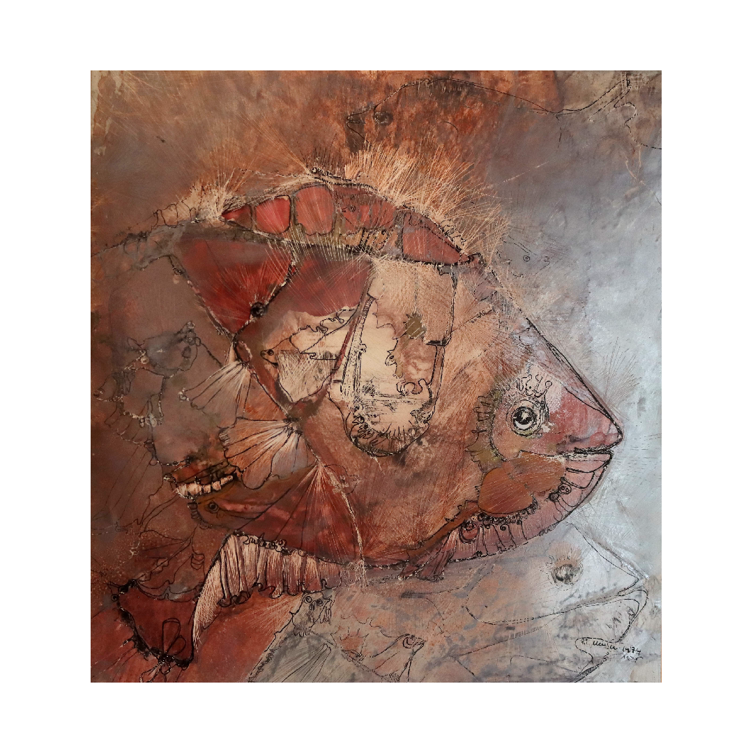 Der „Seltsame Fisch“ ist mehr als nur ein Tiermotiv – er ist ein Sinnbild. Seine Form scheint aus mehreren Ebenen zu bestehen, halb aus Farbe, halb aus Erinnerung. Zwischen seinen Schuppen und Linien erscheinen feine Gravuren und Andeutungen anderer Wesen – Vögel, Gesichter, Gestalten. Der Fisch trägt sie alle in sich, als Hüter verborgener Geschichten.