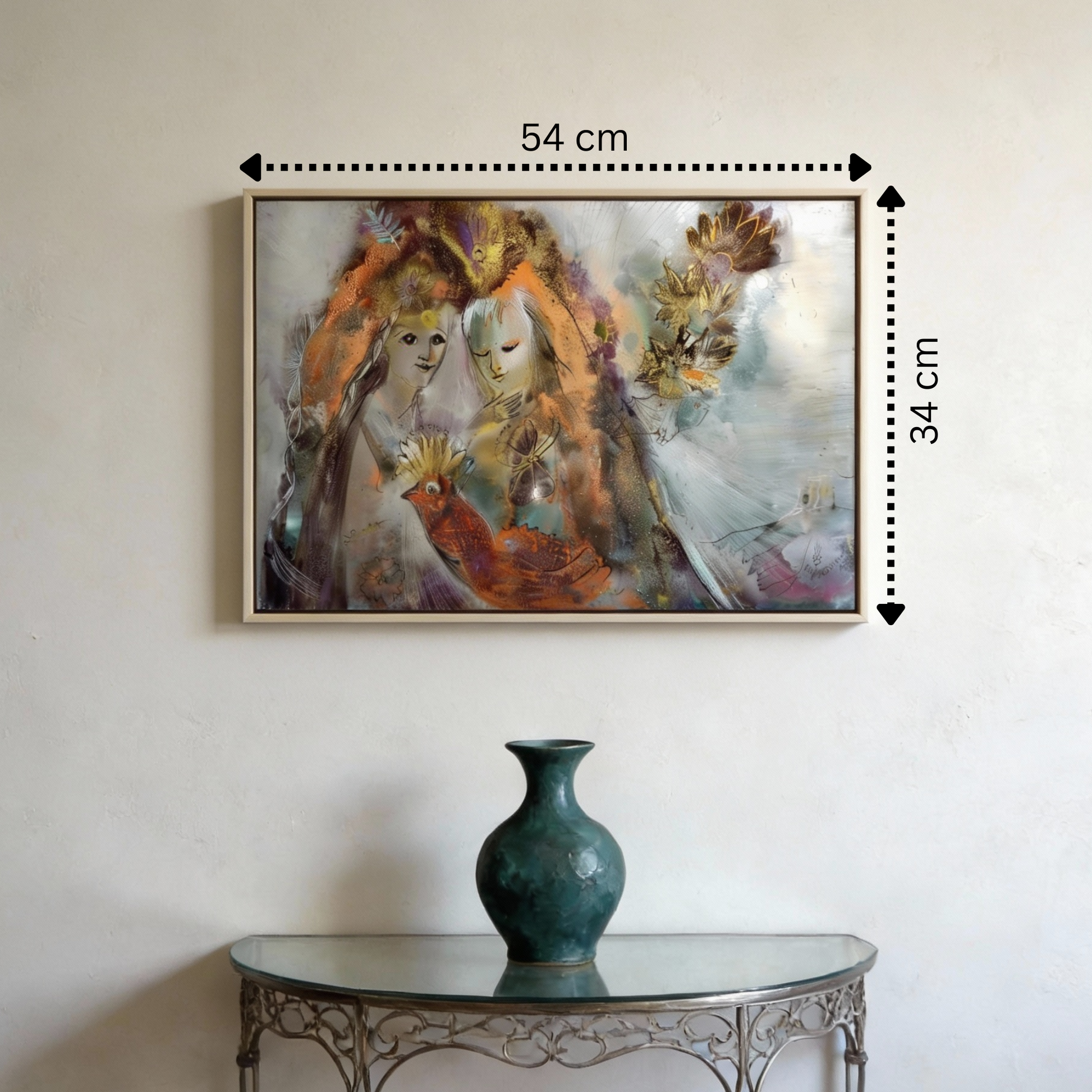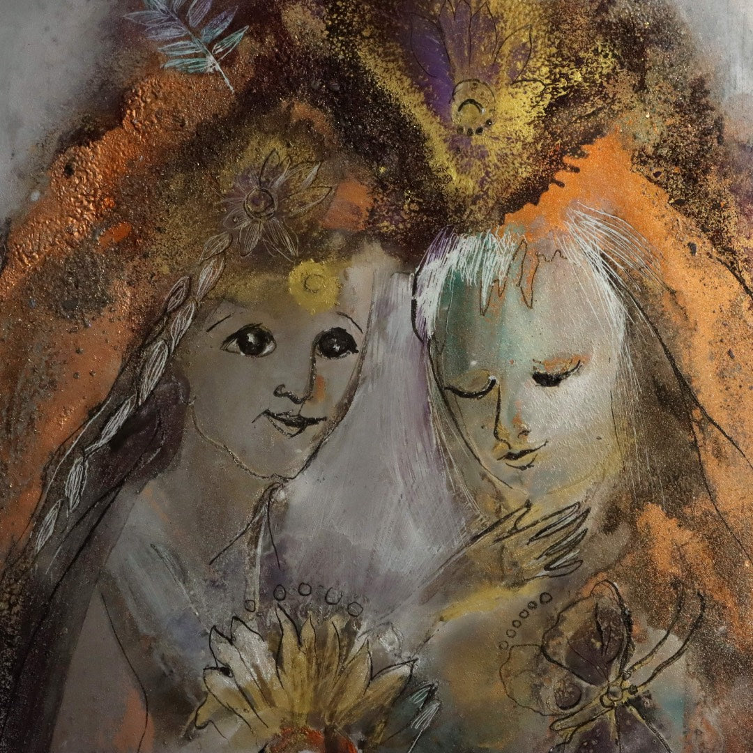 Umgeben sind die beiden von Vögeln, Blüten und schwebenden Formen. Sie wirken wie Sinnbilder für Schutz, Lebendigkeit und das fragile Gleichgewicht zwischen Mensch und Natur. Der Vogel im Vordergrund, warm leuchtend in Orange und Gold, scheint das Paar zu begleiten – als Wächter oder als Ausdruck gemeinsamer Energie.