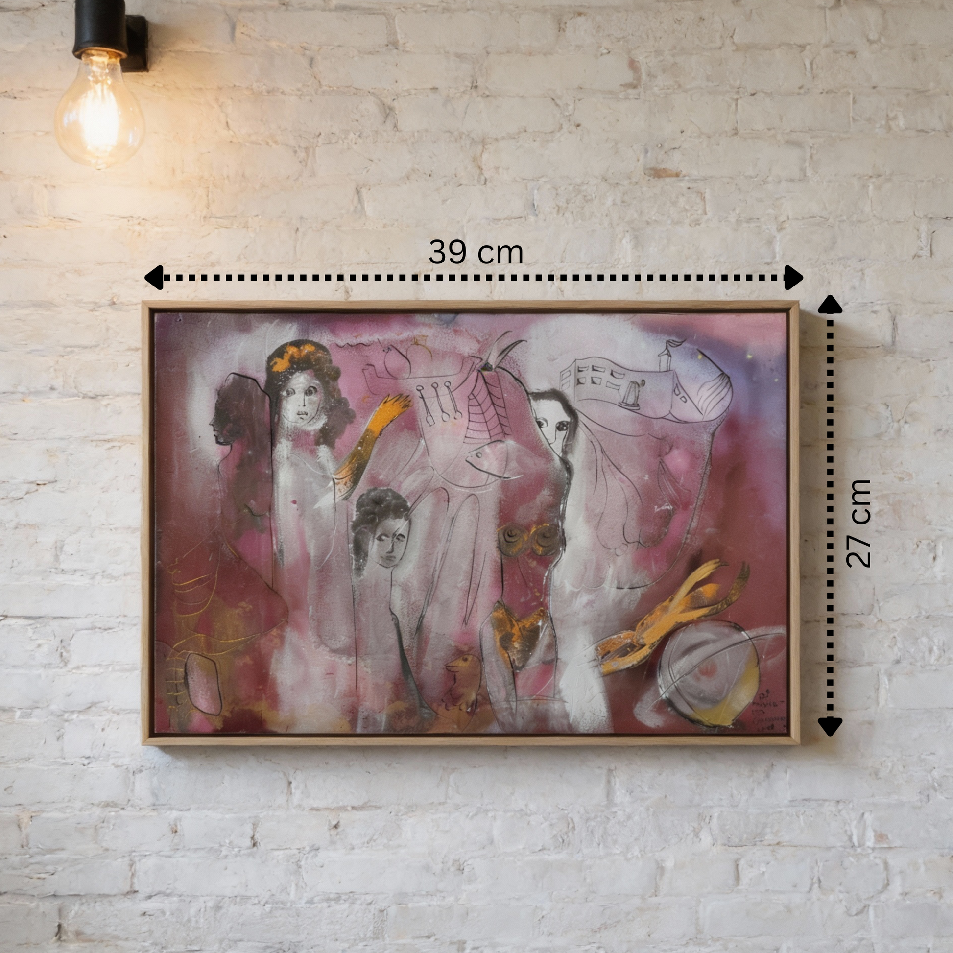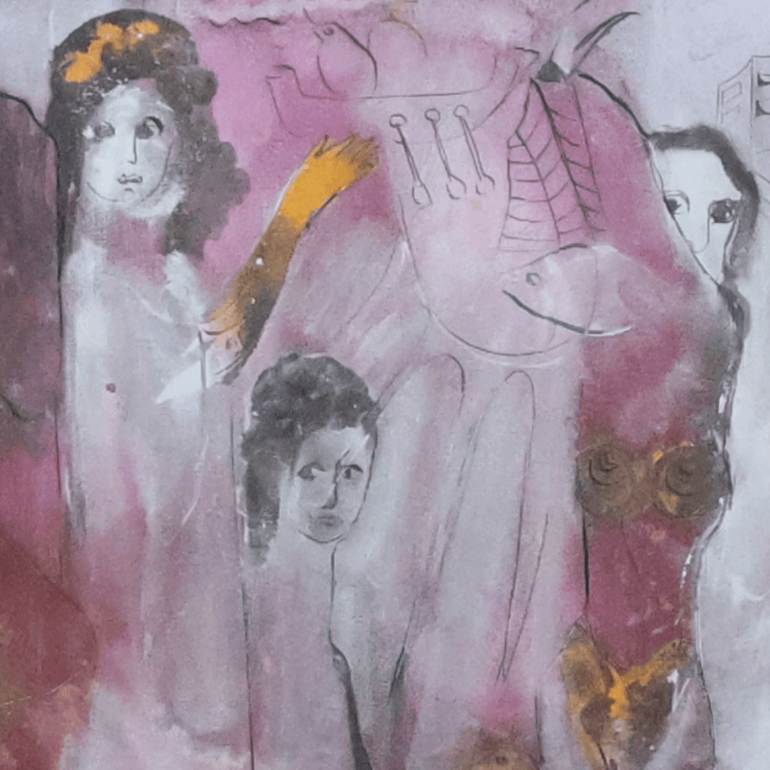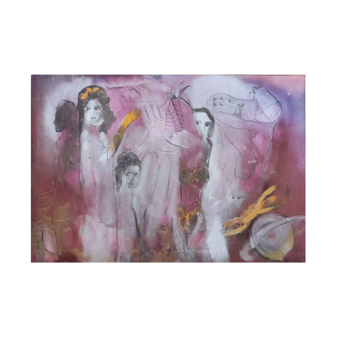 Die Farbwelt aus Rosé, Violett, Grau und warmen Goldakzenten verleiht dem Bild eine fragile, beinahe schwebende Atmosphäre. In der Mono-Sgraffito-Technik überlagern sich Malerei und Zeichnung, Figuren tauchen auf und verschwinden wieder im Farbraum – als wären sie Teil eines kollektiven Gedankens.