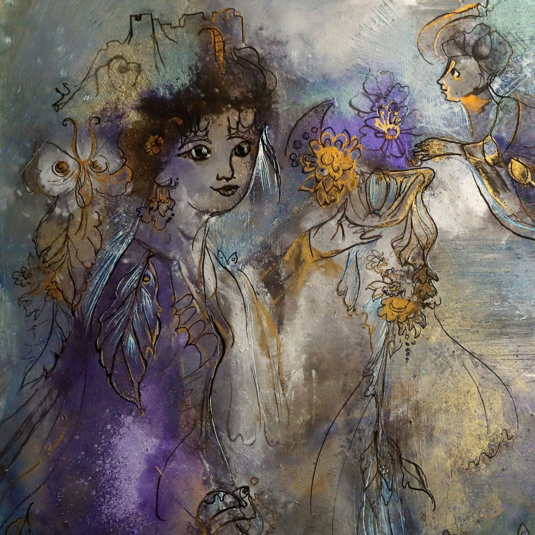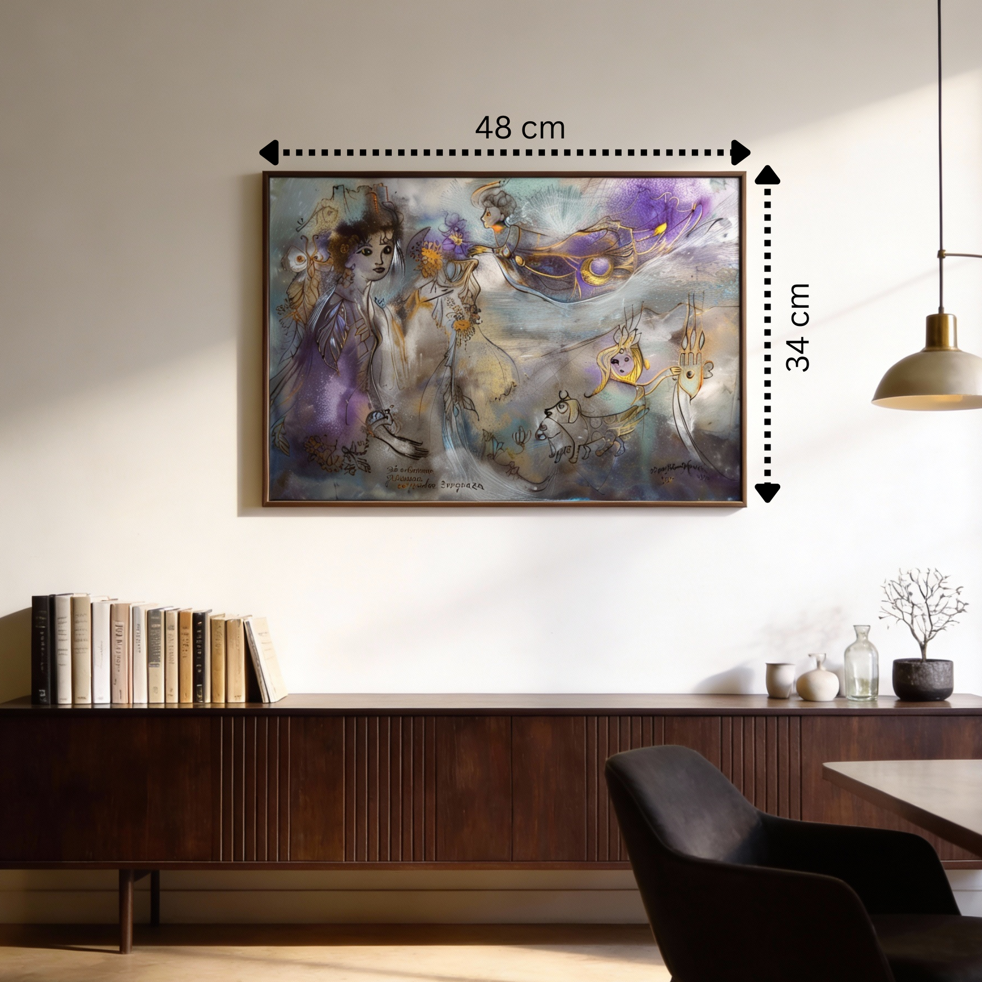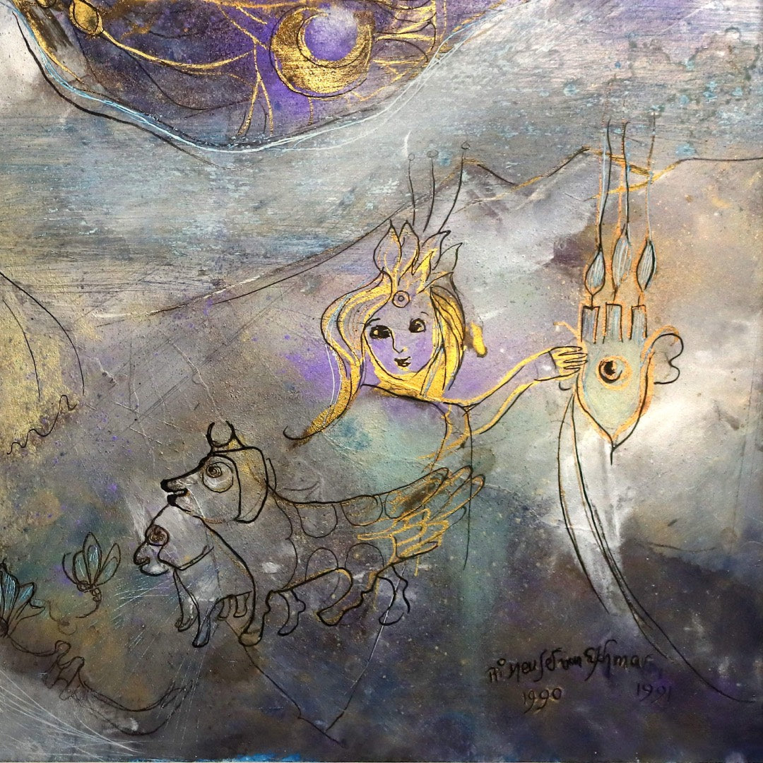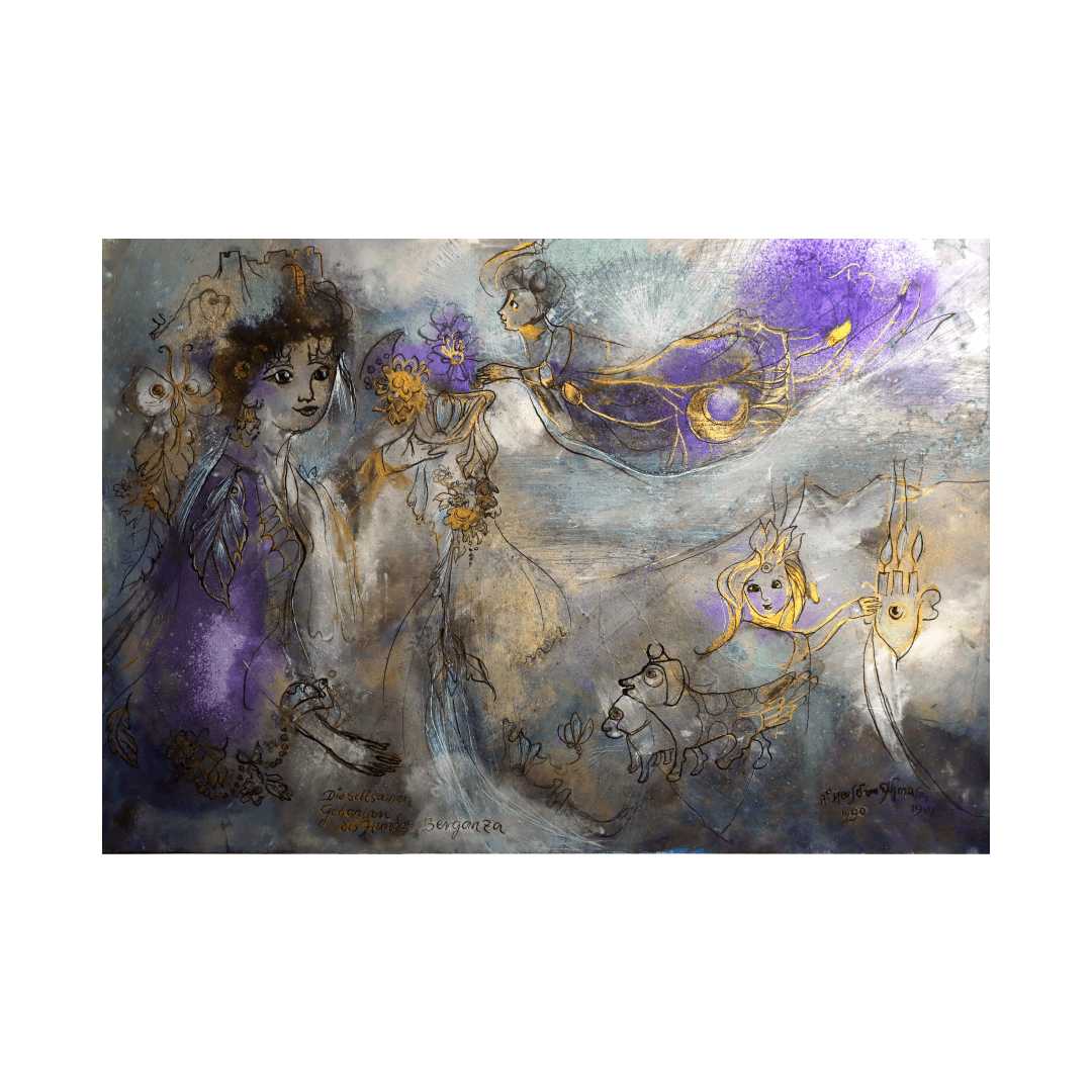 Im Zentrum stehen weibliche Figuren, ruhig im Ausdruck, fast beobachtend. Um sie herum entfaltet sich eine märchenhafte Welt aus fliegenden Wesen, Tieren und symbolischen Formen. Goldene Linien und violette Farbfelder verleihen dem Bild eine besondere Spannung zwischen Tiefe und Leichtigkeit. Es wirkt, als würden innere Bilder nach außen drängen, ohne sich vollständig erklären zu wollen.