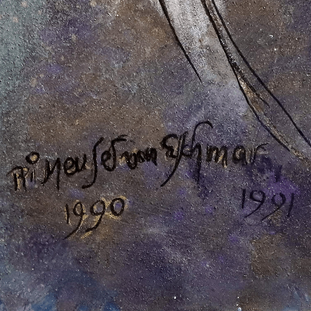 In der Mono-Sgraffito-Technik verbindet Ri Meuser von Eschmar Zeichnung und Farbe zu einer lebendigen Oberfläche. Linien tauchen auf, verschwinden wieder, Figuren lösen sich im Raum auf und formieren sich neu. Das Bild folgt keinem festen Narrativ – es denkt in Bildern, nicht in Worten.