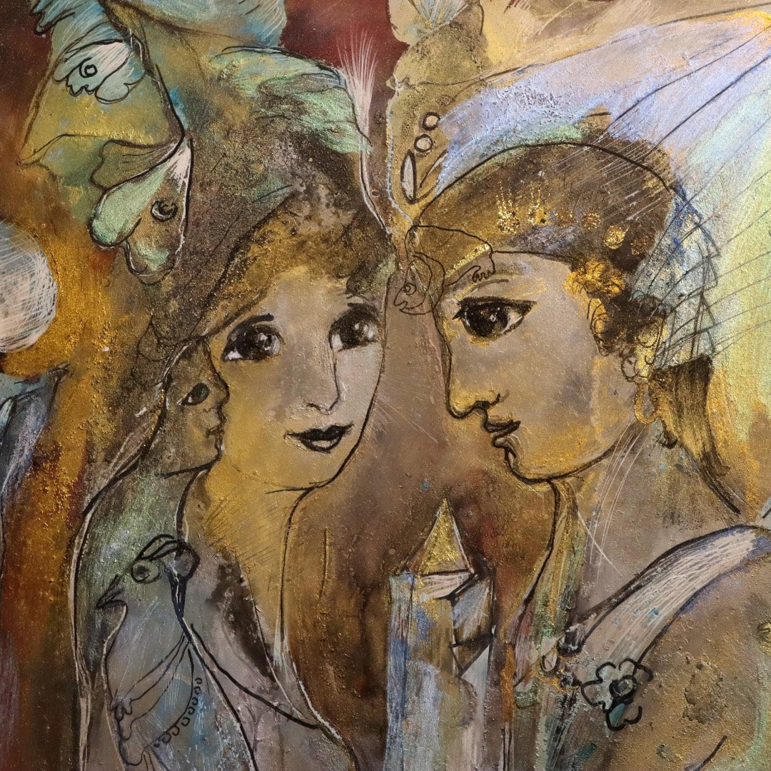 Umgeben sind sie von weiteren Gestalten, Vögeln und schwebenden Formen, die wie Zeugen oder innere Begleiter wirken. Sie verleihen der Szene Tiefe und verweisen auf das, was eine Verbindung trägt: Erinnerung, Schutz und gemeinsames Werden. Der Raum bleibt offen, fast traumartig, ohne klare Grenzen.