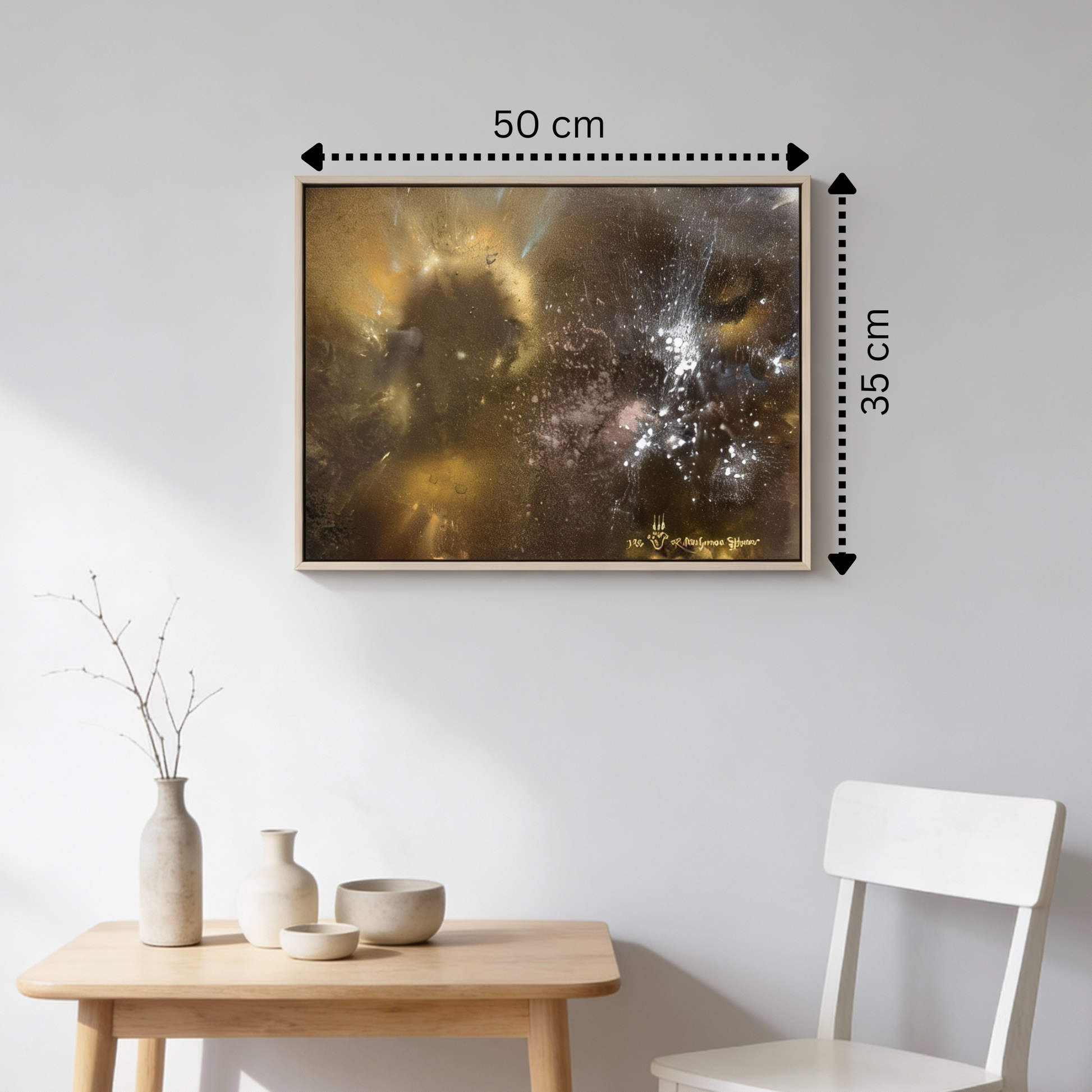 „Spaceart“ ist ein Blick ins Unendliche. Kein konkreter Raum, kein fixierbarer Ort – vielmehr ein energetisches Feld aus Licht, Bewegung und Tiefe. Goldene Flächen breiten sich aus wie kosmischer Staub, durchzogen von hellen Explosionen und feinen Sprenkeln, die an Sterne, Nebel oder ferne Galaxien erinnern.
