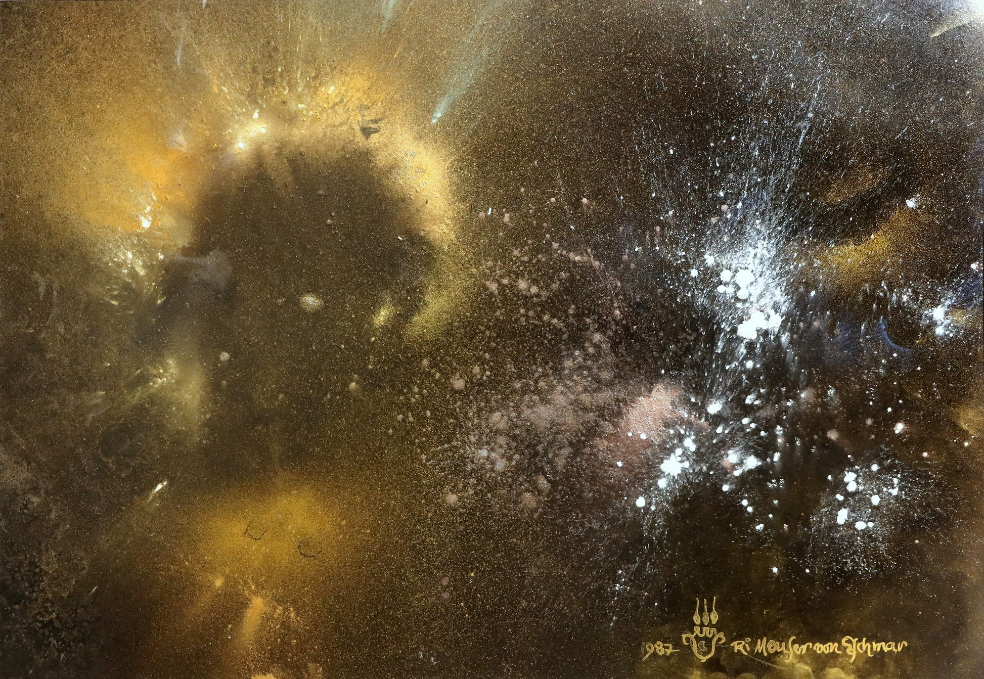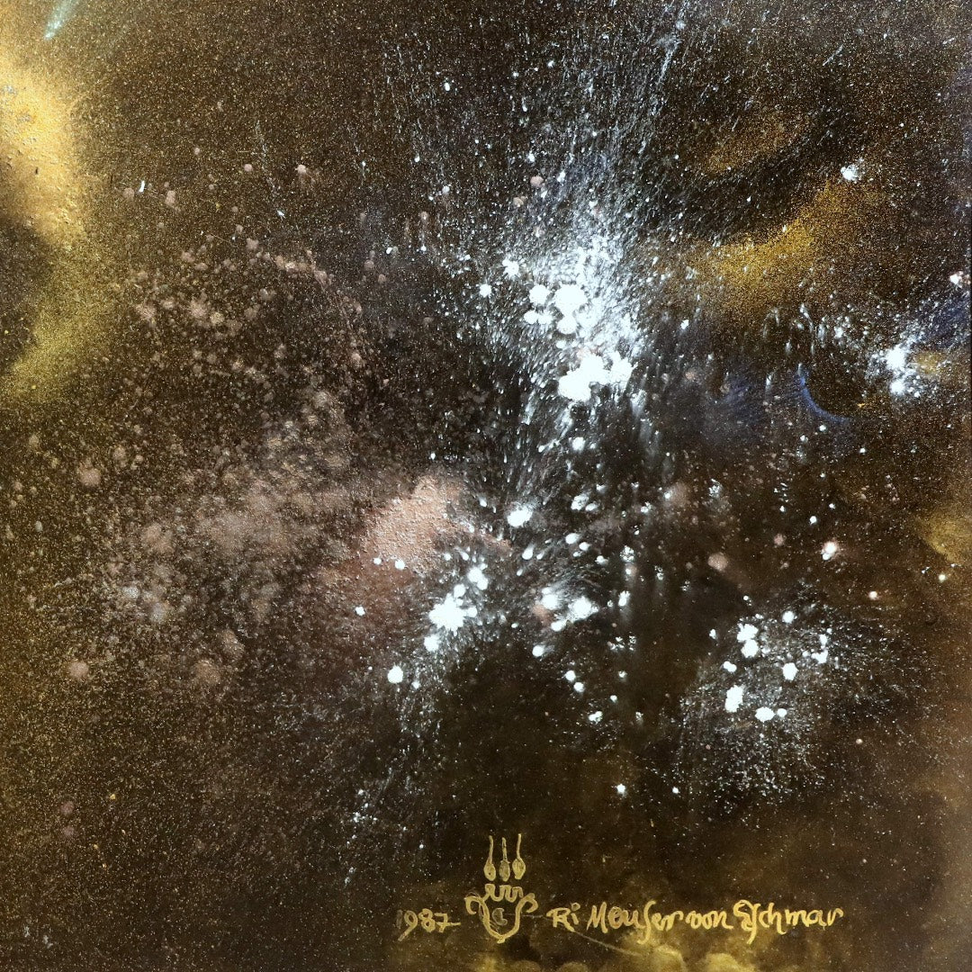 Ri Meuser von Eschmar arbeitet hier jenseits figürlicher Darstellung. Farbe, Struktur und Rhythmus übernehmen die Erzählung. Gold steht für Energie und Ursprung, dunkle Zonen für Tiefe und Unbekanntes, helle Einschlüsse für Impulse und Entstehung. Das Bild wirkt, als sei es nicht gemalt, sondern entstanden – wie ein natürlicher Prozess.