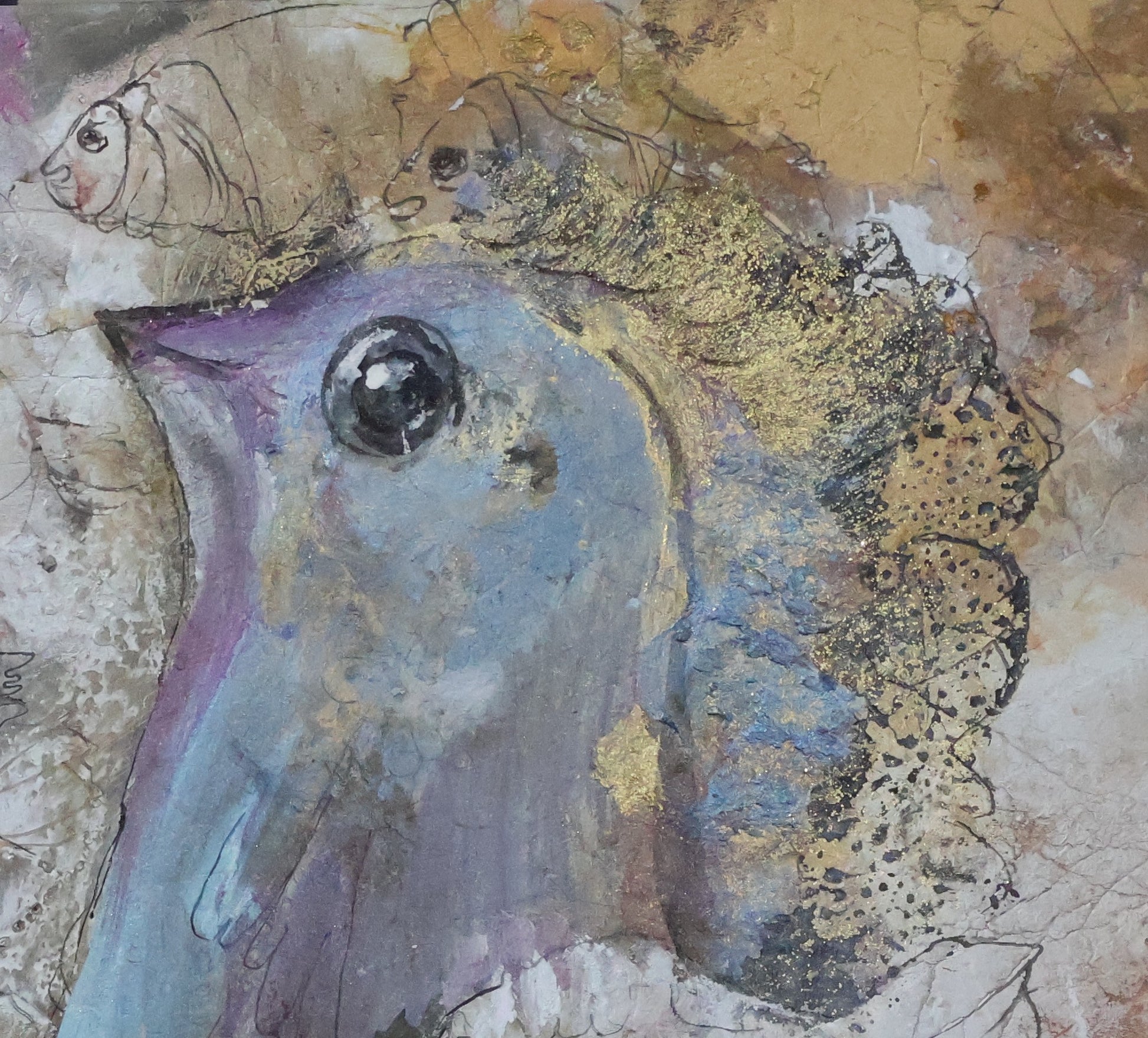 Mit ihrer charakteristischen Mono Sgraffito-Technik erschafft Meuser eine Tiefe, die über das rein Abbildhafte hinausgeht. Die Schichten aus Pigment und Struktur verleihen den Federn eine lebendige Textur – als könne man das zarte Rascheln des Gefieders spüren. Gold- und Erdtöne wechseln sich mit zarten Blauschattierungen ab, wodurch ein sanftes, beinahe spirituelles Leuchten entsteht.