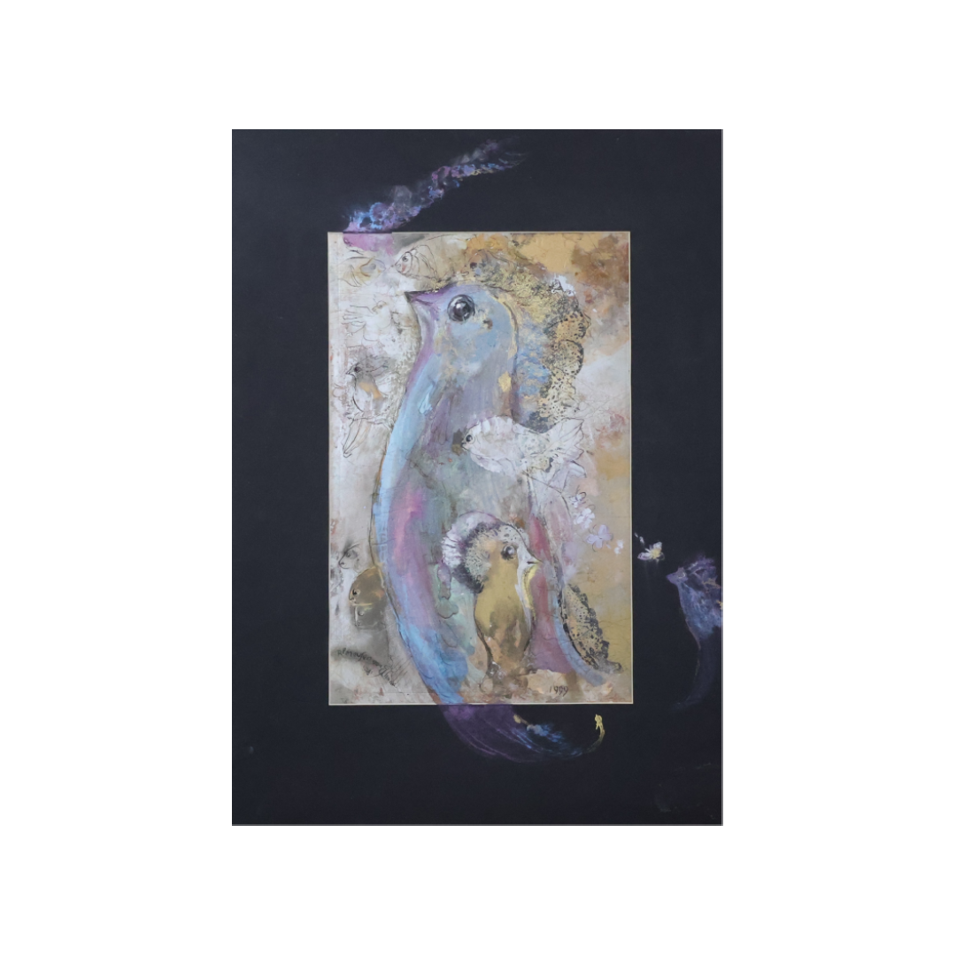 Das Originalgemälde „Vogelfamilie“ (1991) zeigt eine poetische Szene aus der Natur, die Ri Meuser von Eschmars Sinn für Verbundenheit und Harmonie verkörpert. Eine Gruppe farbenprächtiger Vögel sitzt eng beieinander – die Eltern schützend über ihre Jungtiere gebreitet, inmitten einer warm leuchtenden Landschaft. Dieses Motiv steht sinnbildlich für familiären Zusammenhalt, Fürsorge und den Kreislauf des Lebens.