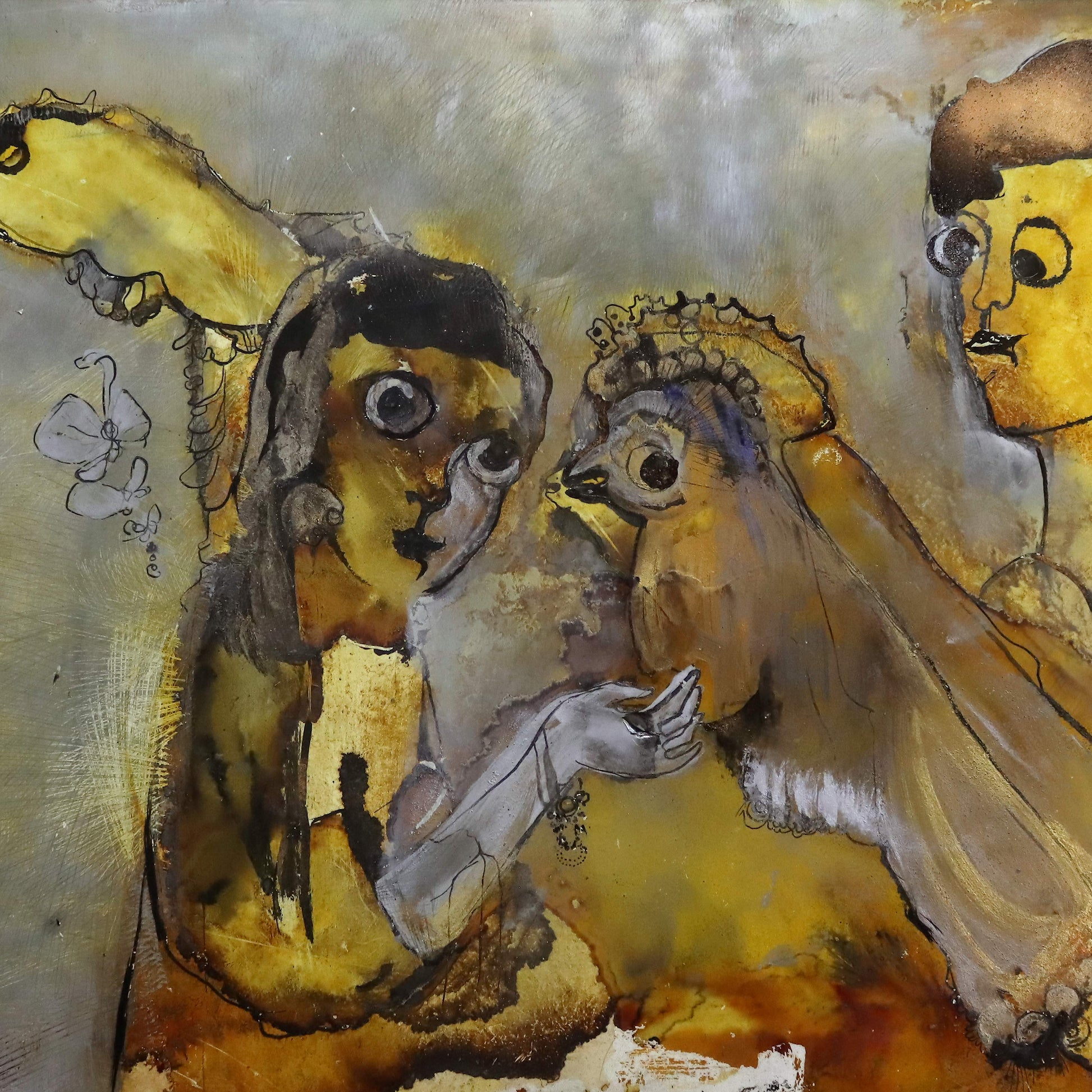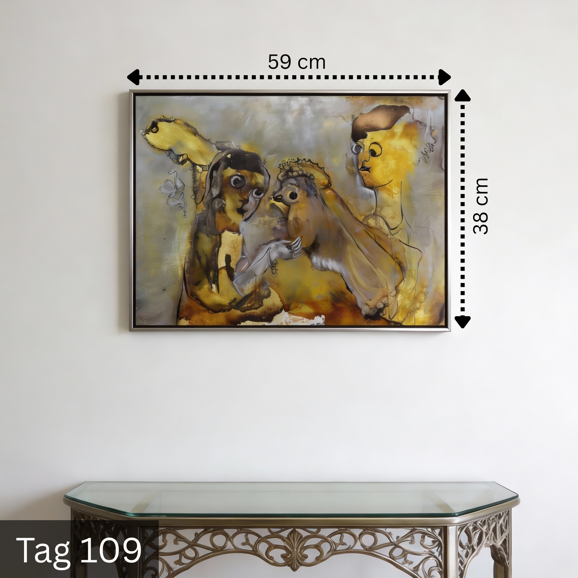 Dieses Werk von Ri Meuser von Eschmar hält den Moment fest, in dem sich etwas entscheidet – noch bevor der erste Schritt getan wird. Drei Figuren stehen einander gegenüber, verbunden durch Blicke, Gesten und ein unsichtbares Band aus Erwartung und Zögern. Es ist kein Abschied, kein Aufbruch, sondern der Atemzug dazwischen.